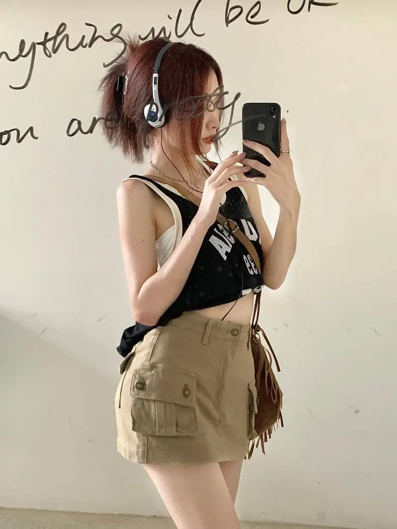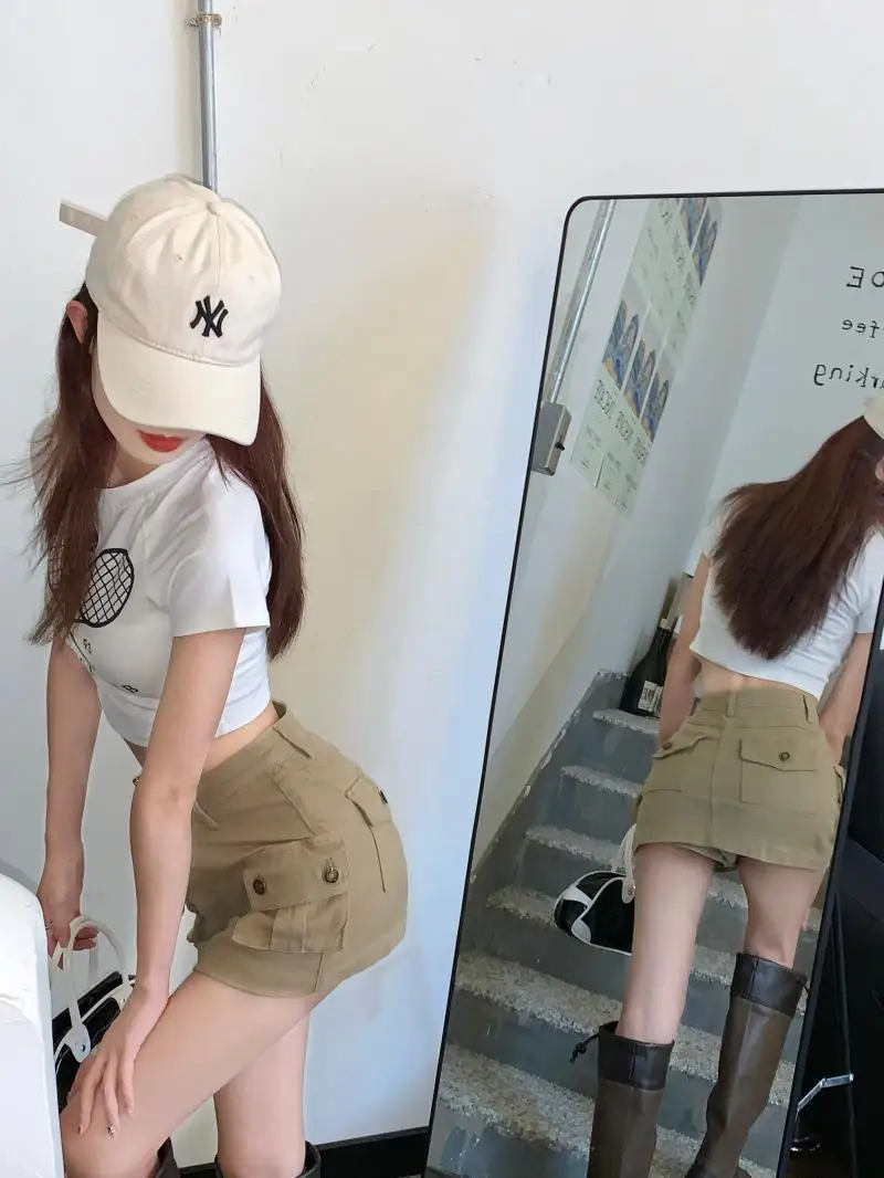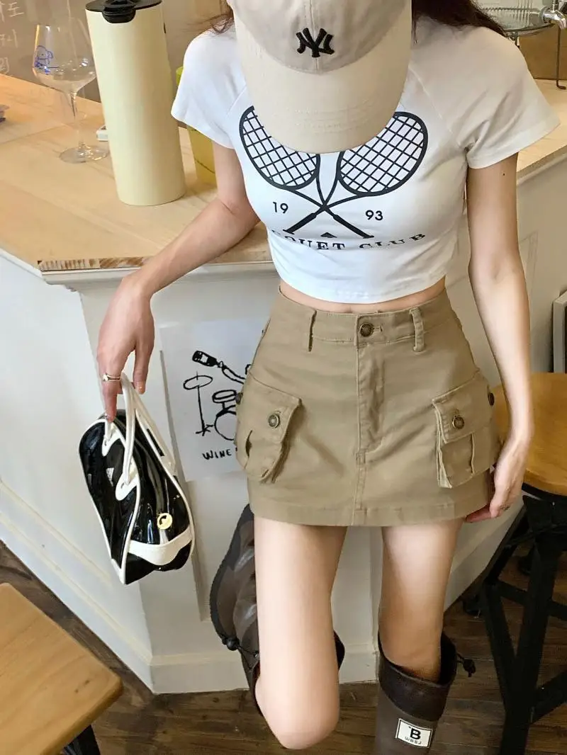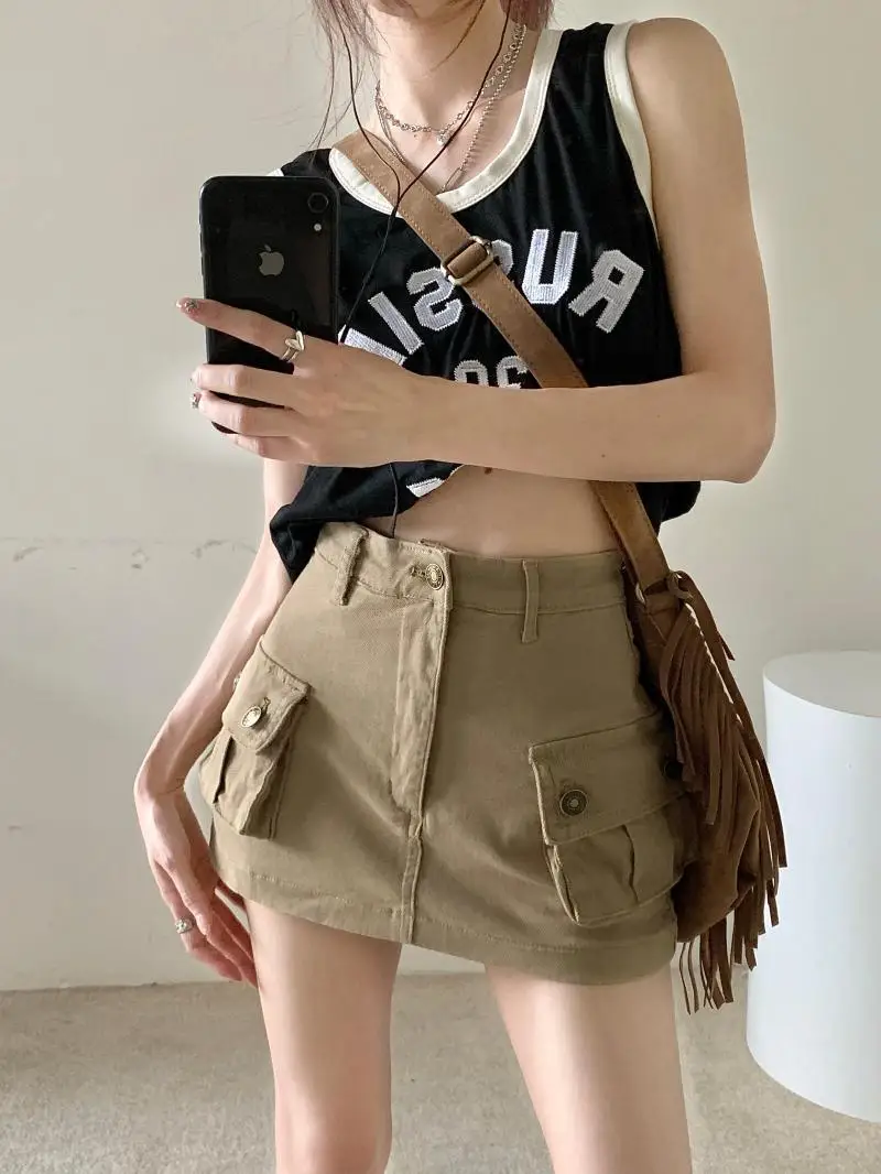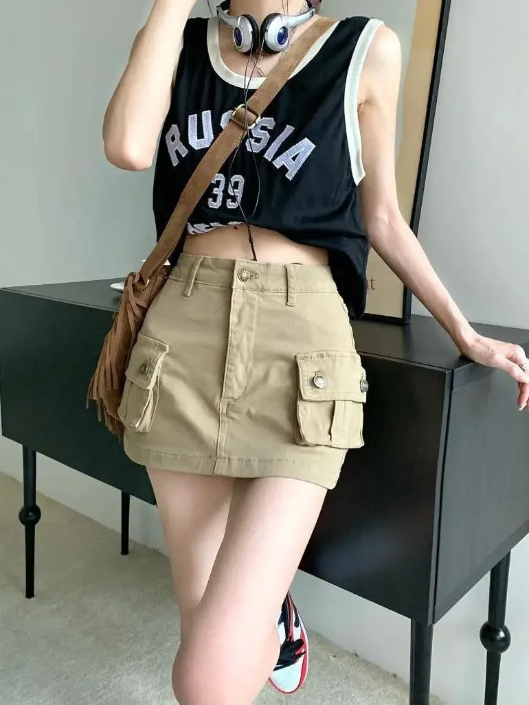 2025 new cargo khaki skirts with pocket woman streetwear clothing women's skirt korea straight skirt women high-waist A-line
