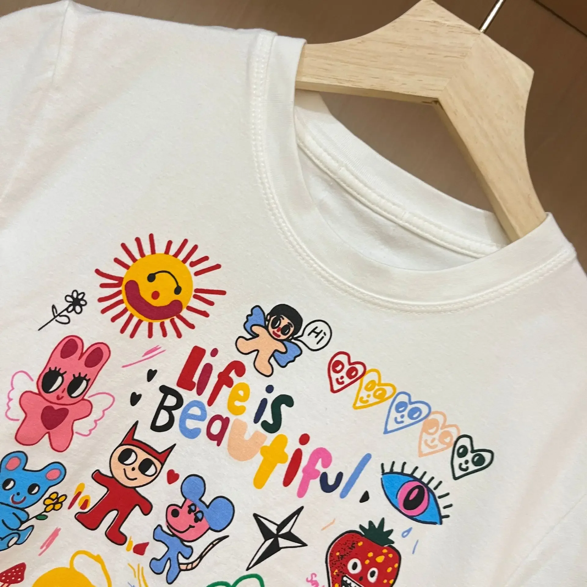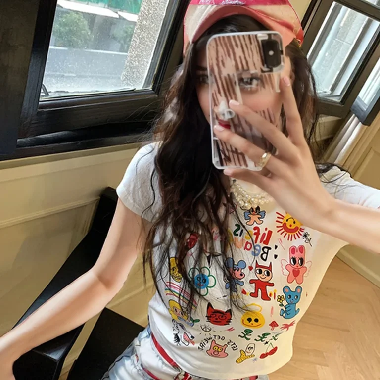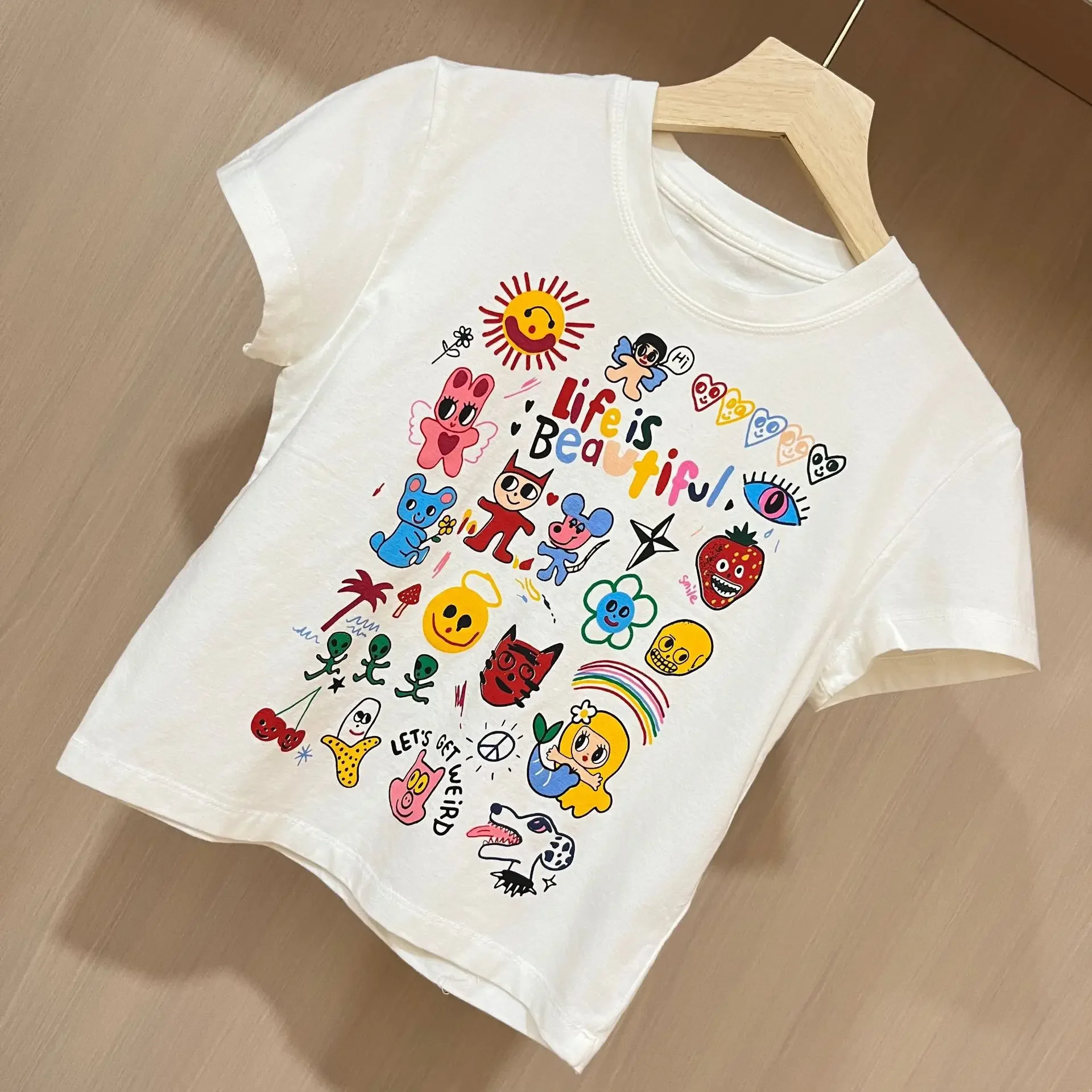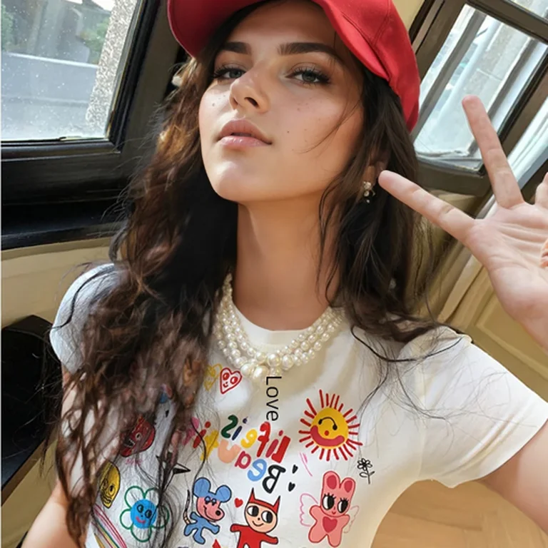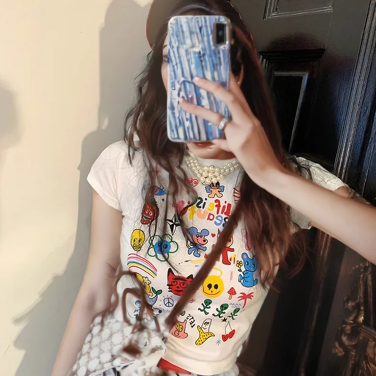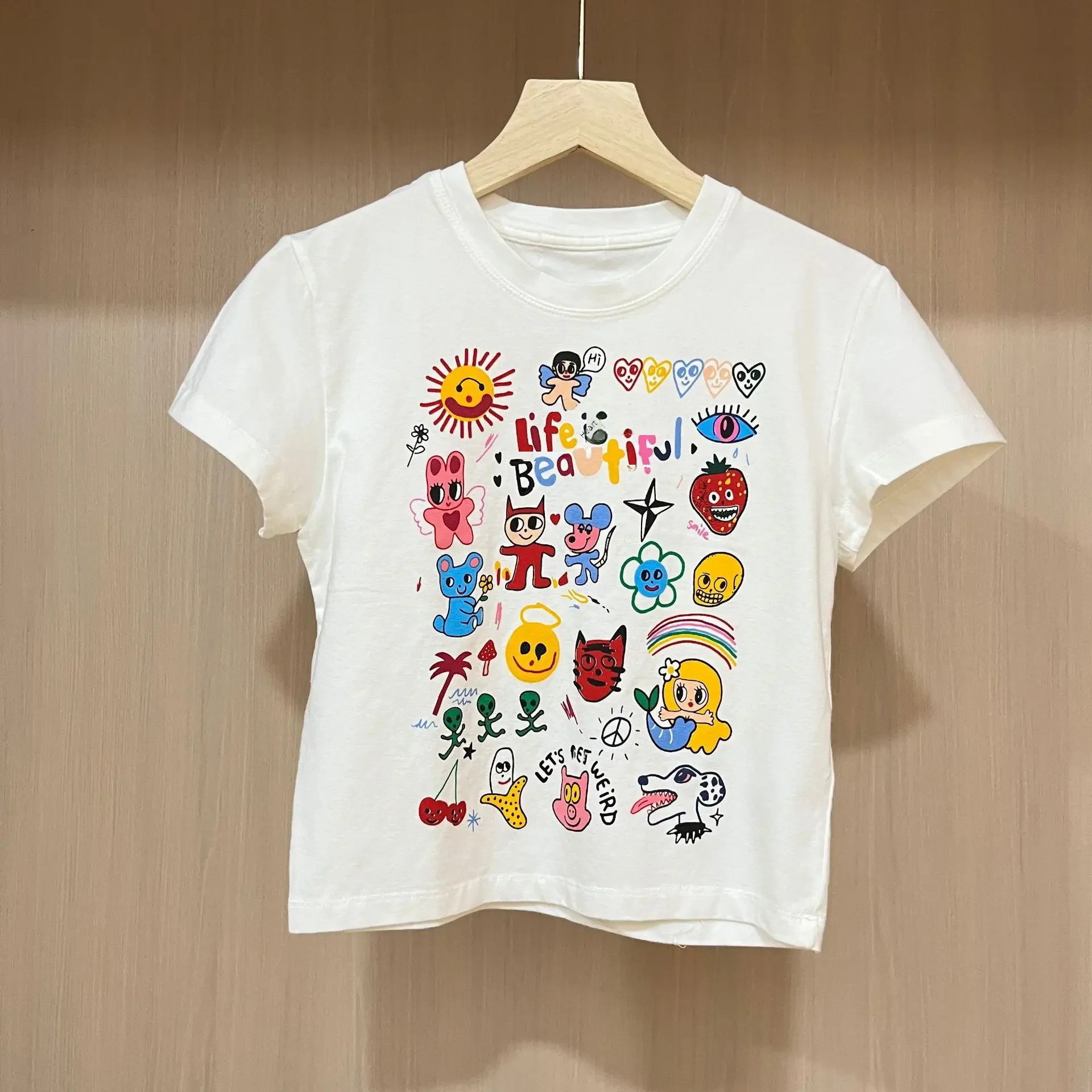American Cartoon T-shirt Women Summer Fun Printed Slim Fit Chili Girl Top Shorts Casual Trendy Exposing Belly