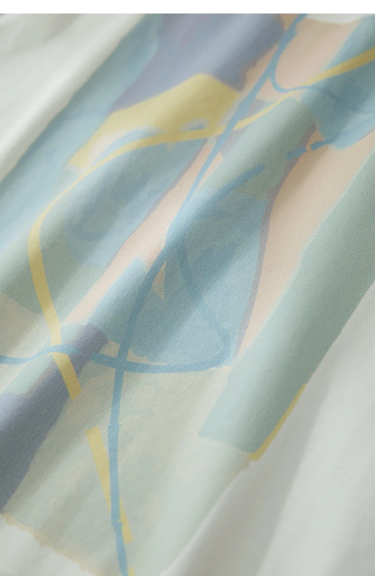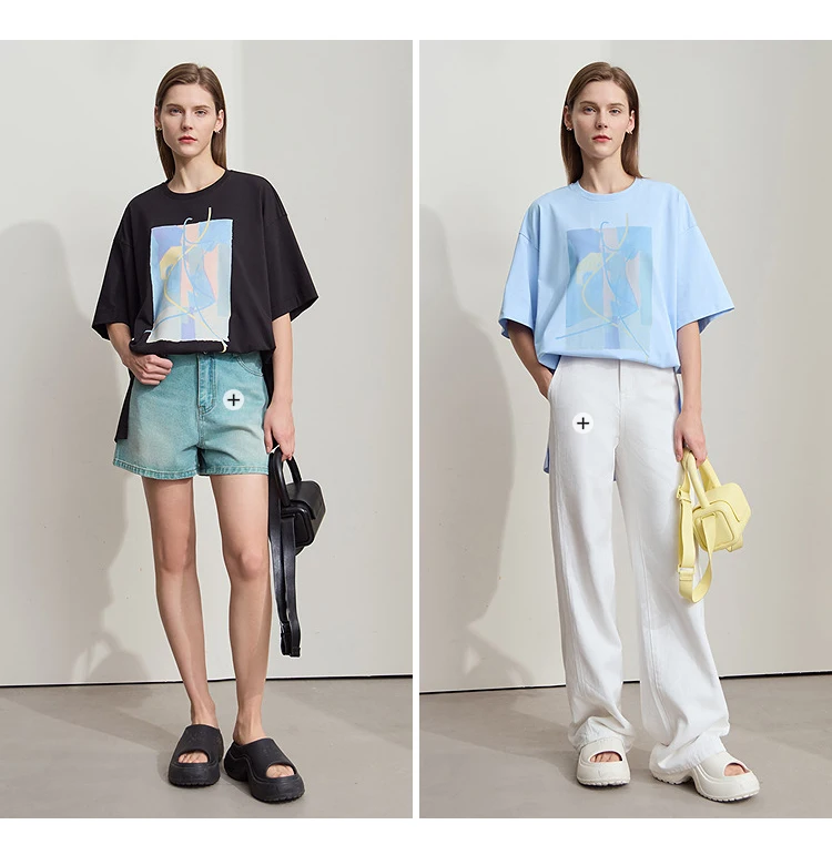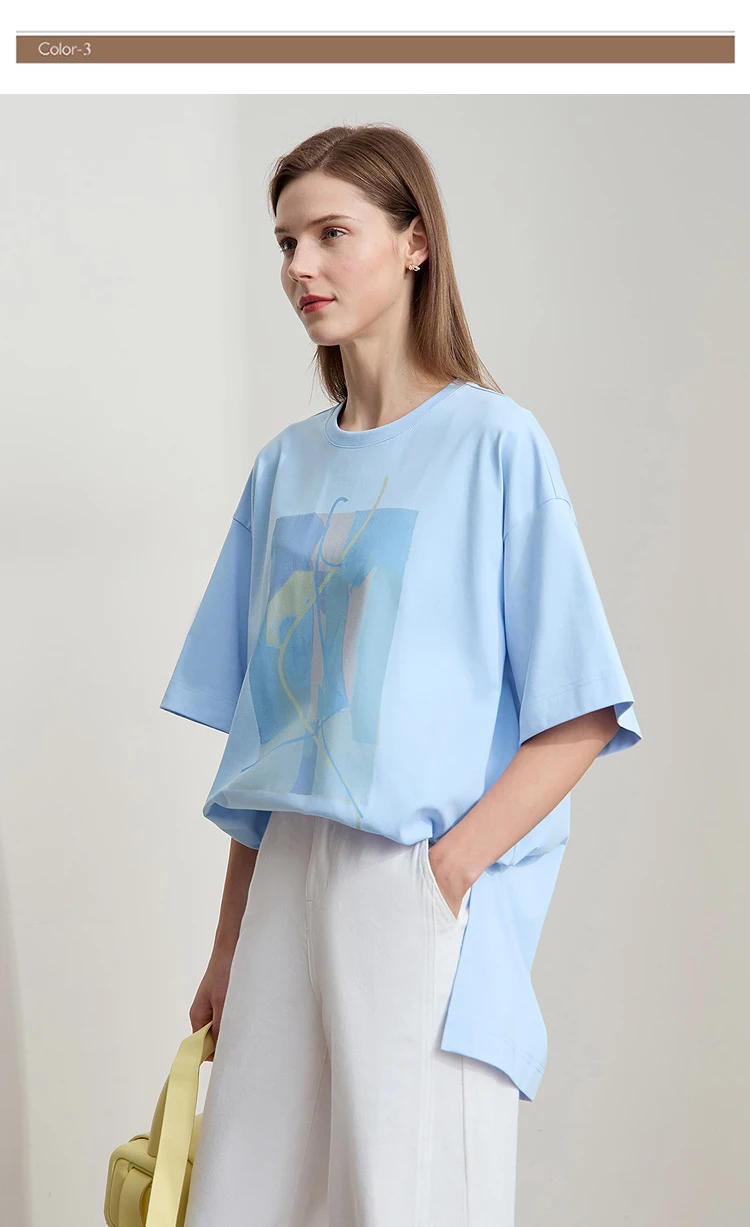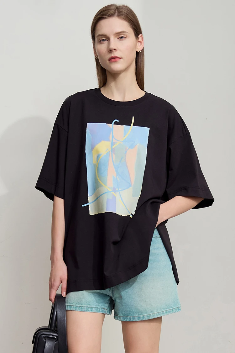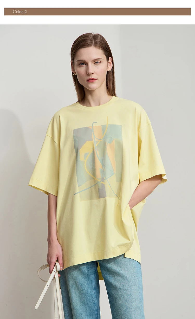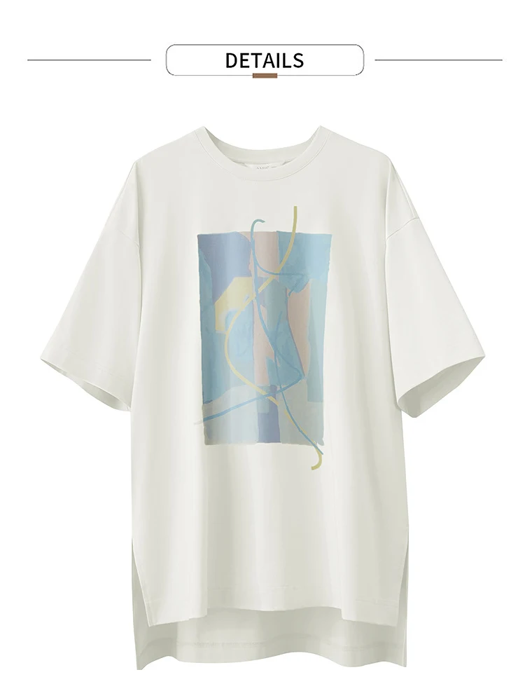 Amii Minimalist Summer T-shirt Women Irregular Design Tops Casual O-neck Abstract Print Loose Dropped Shoulder T-shirt 12522081