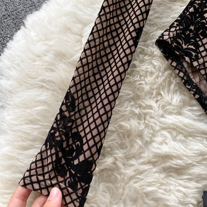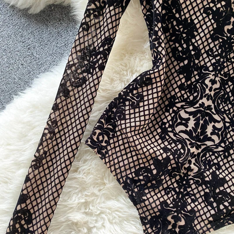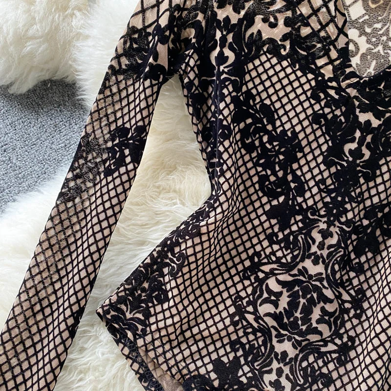 Autumn New Floral Print Bodysuit for Women Fashion Streetwear Elegant Stand Collar Long Sleeve Tight Fit Mesh Body Top Chic 2024