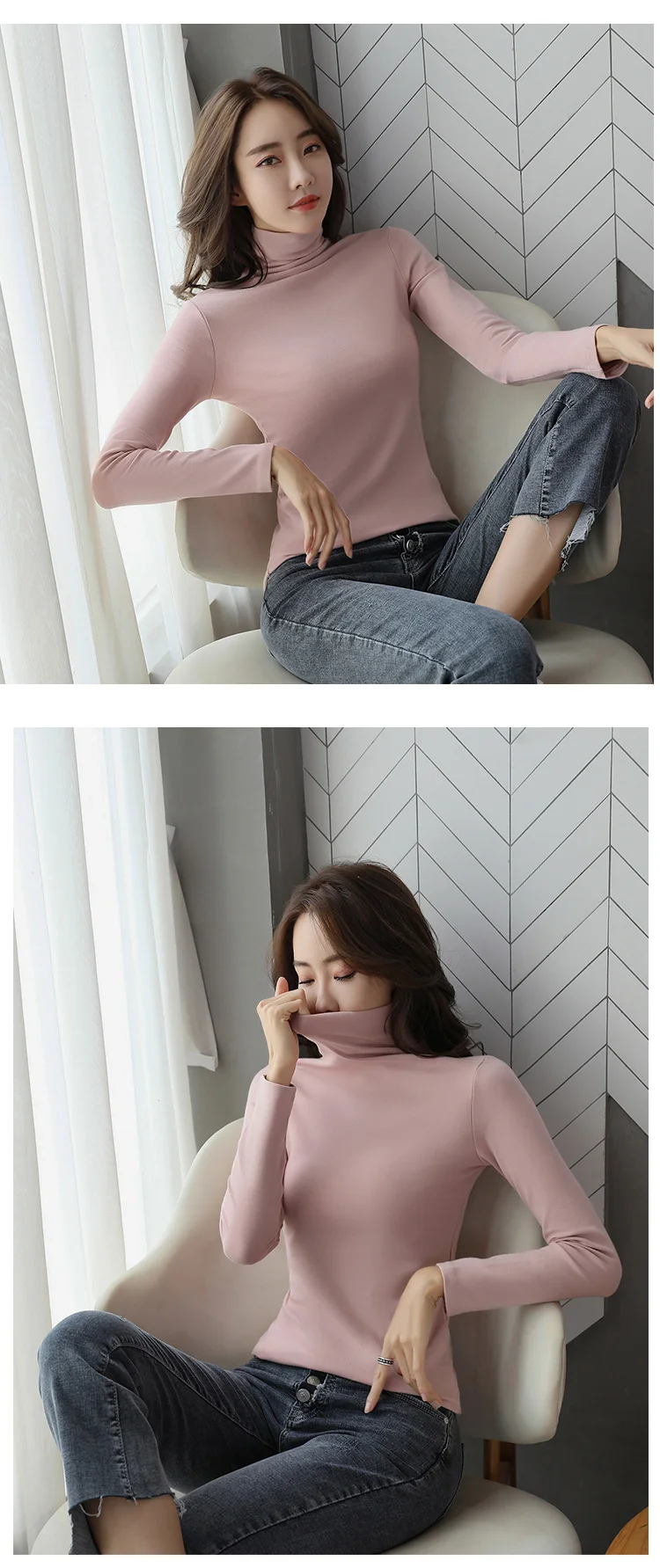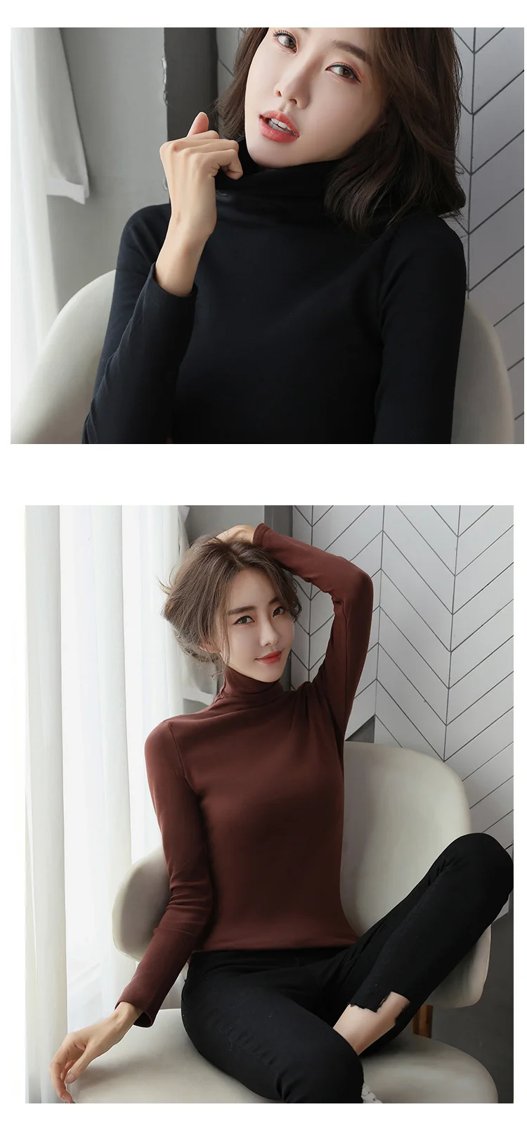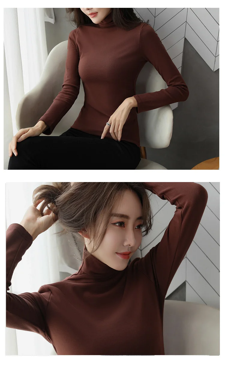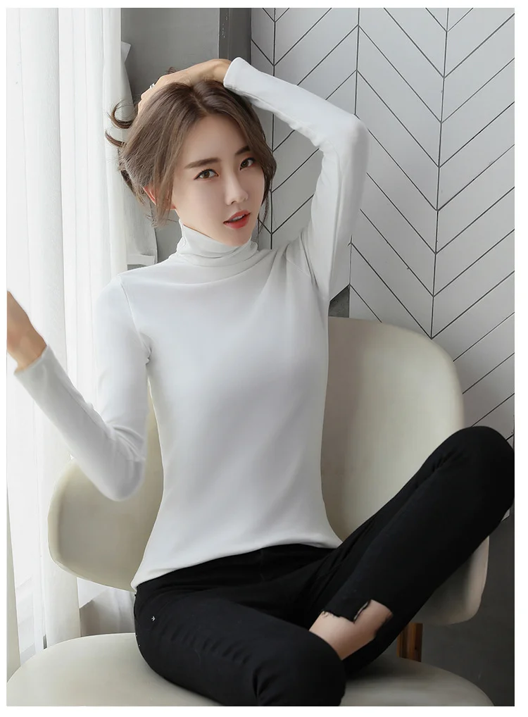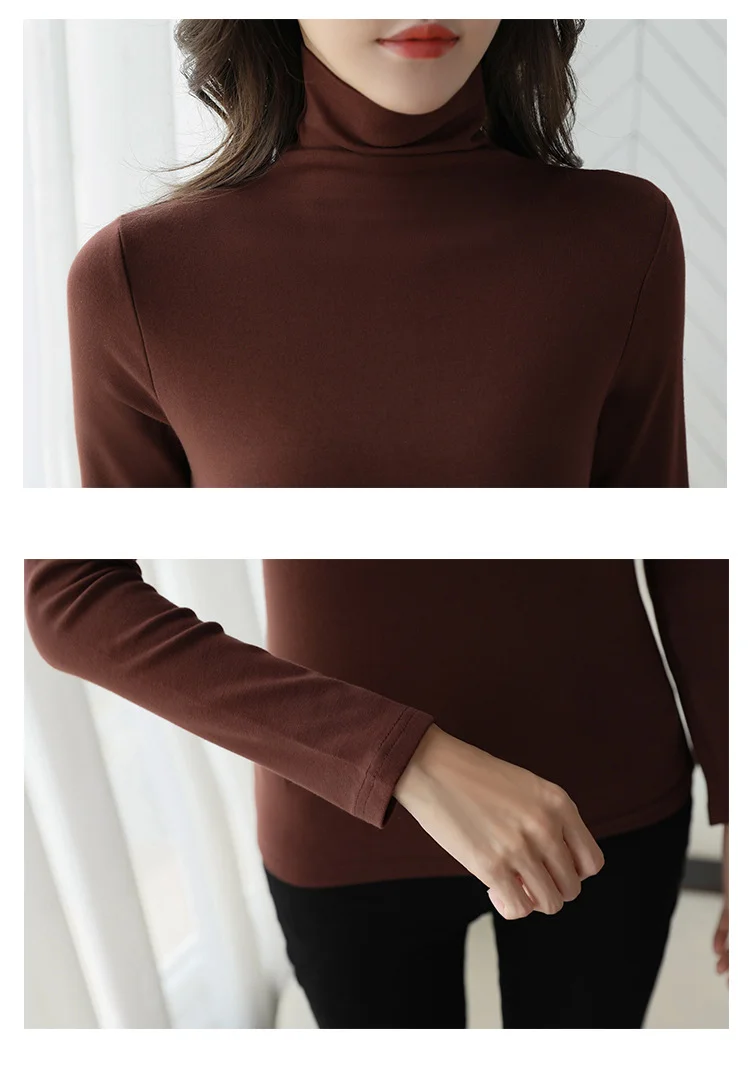 Autumn Women Slim Fit Long Sleeve T-shirt High Collar Fleece Base Shirt Thickened Design Fresh Sweet Style