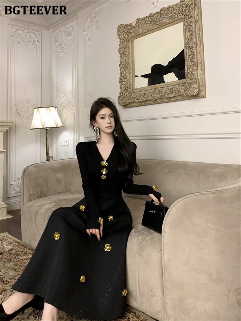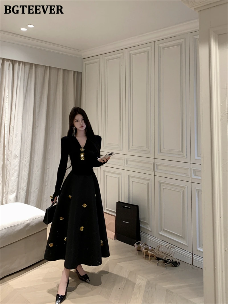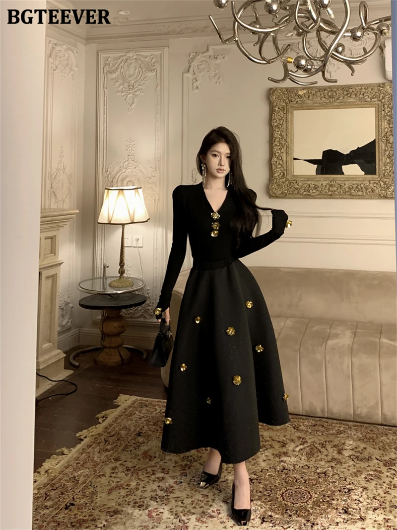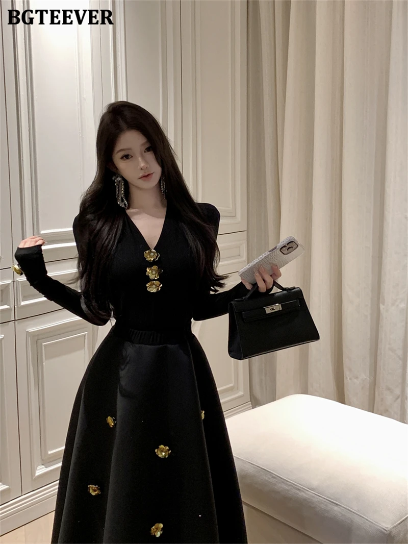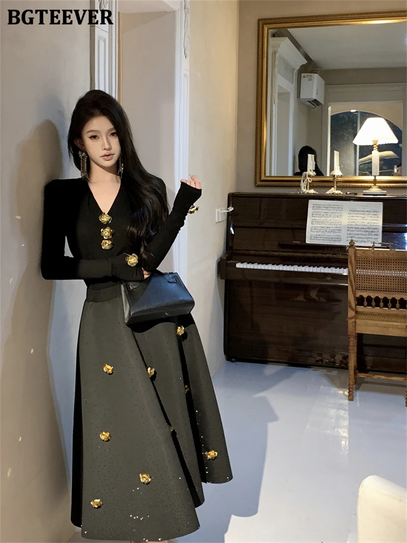 BGTEEVER Spring Elegant Ladies 2 Pieces Skirt Set Long Sleeve V-neck Pullovers & High Waist Loose A-line Skirts Women Outfits