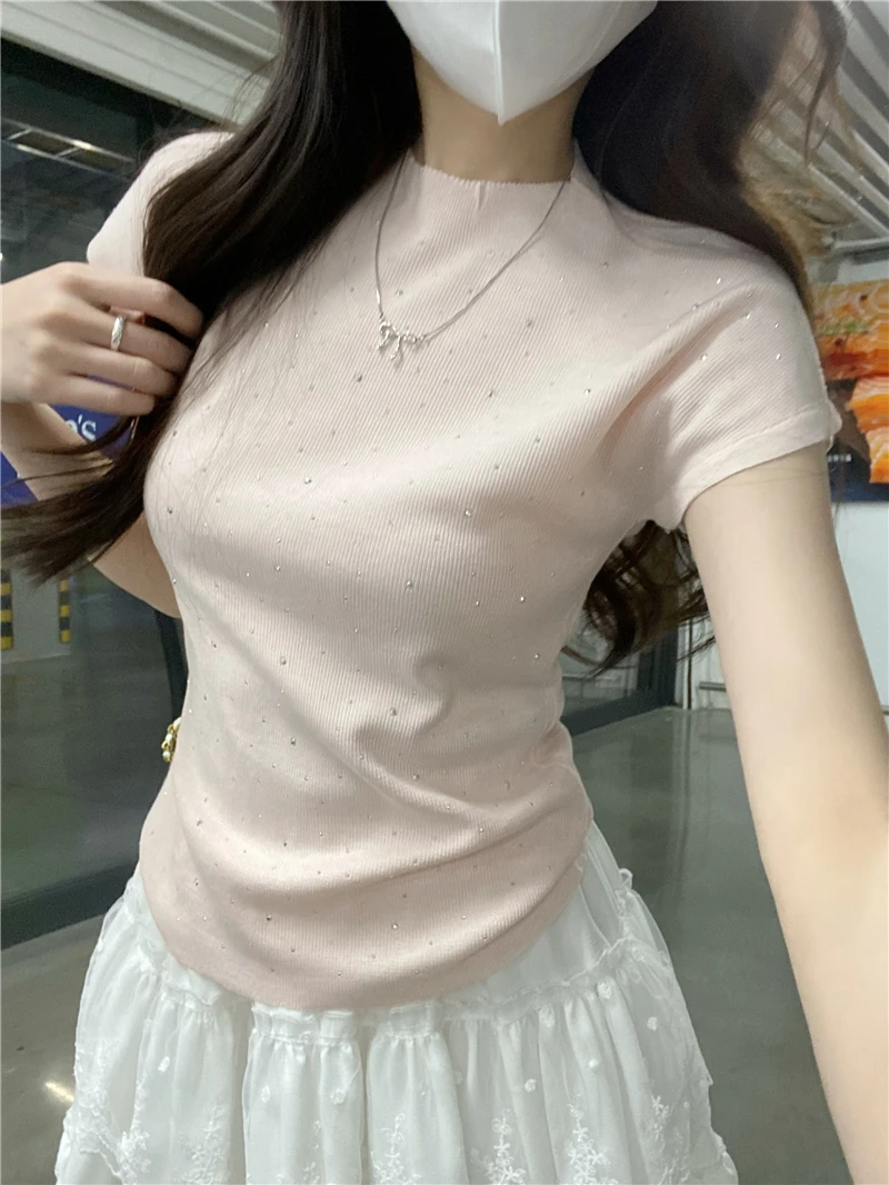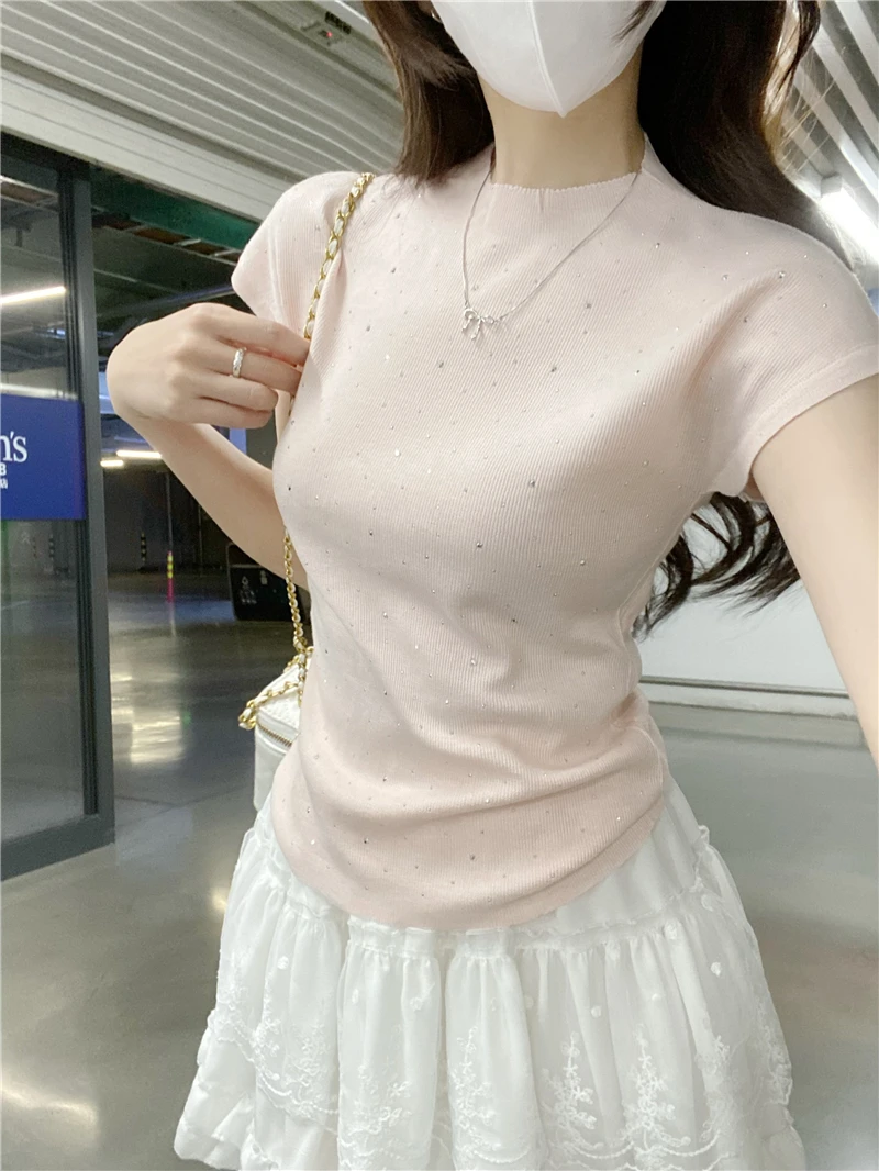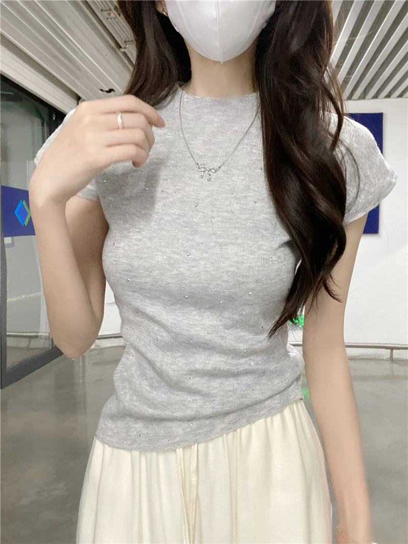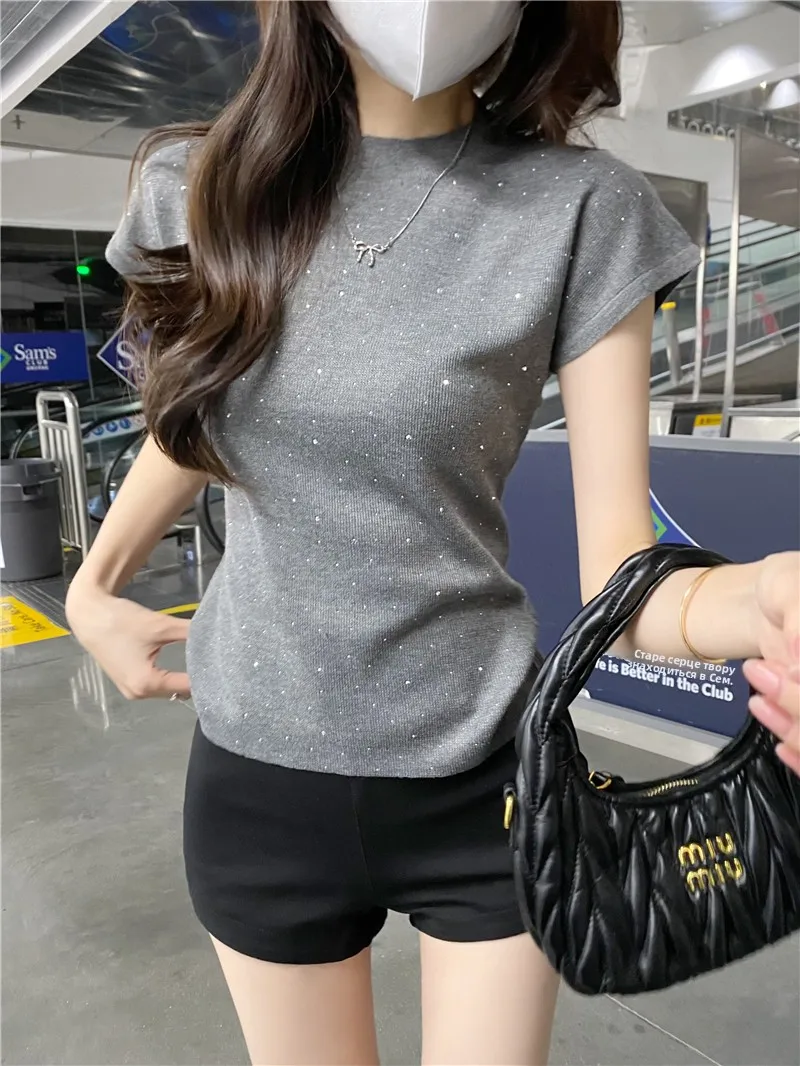 Blue Bead Knitted Top Women's Slim Fit ort Sve round Ne T-irt Summer 2025 New Design Commute Sle Knittedwear