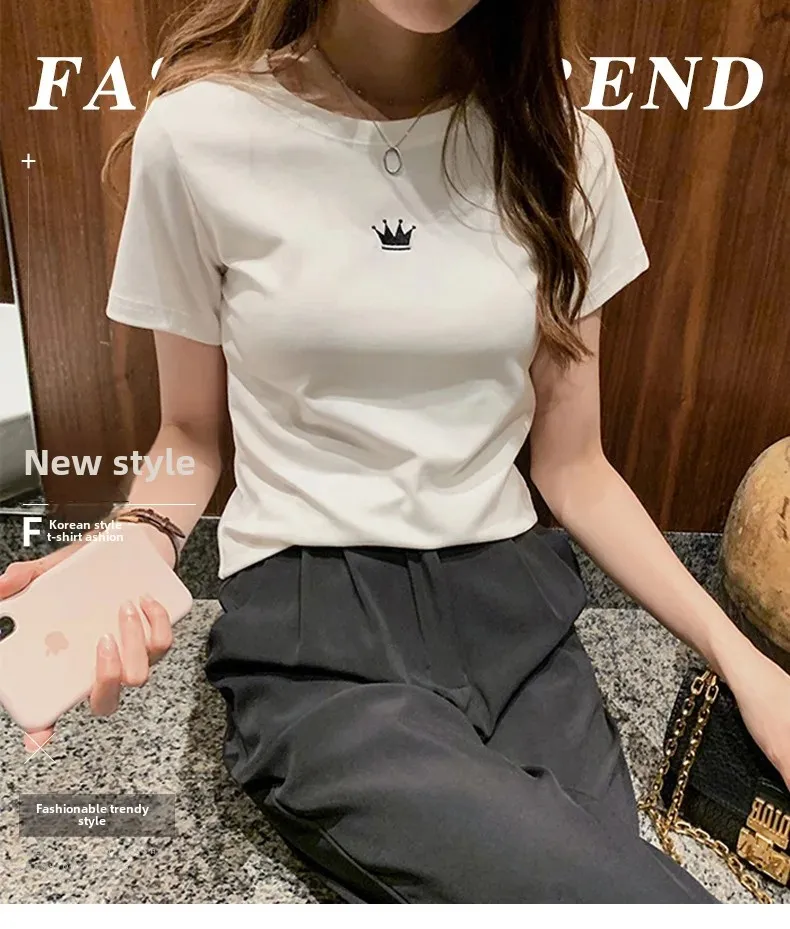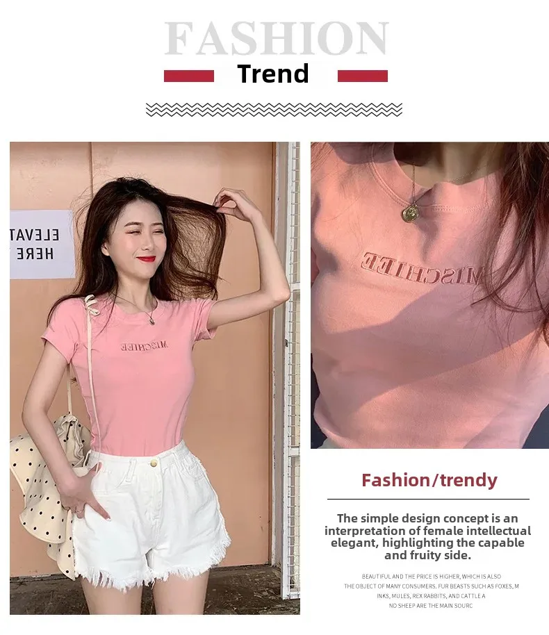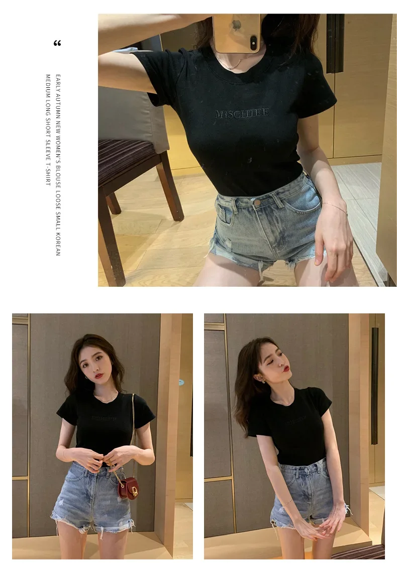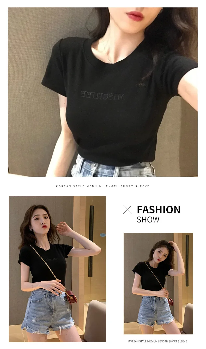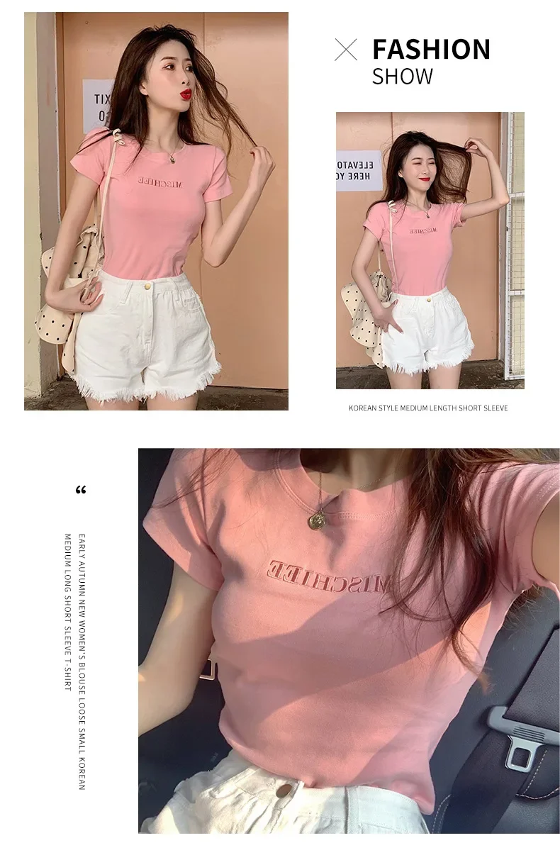 Fashionable Letter Embroidery Short Sleeve T-Shirt Women's Loose-Fit Summer New Style Slimming Base Layer Korean Version