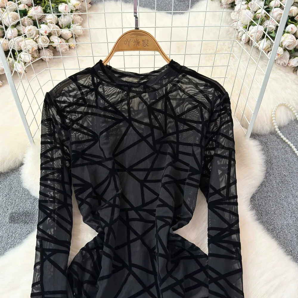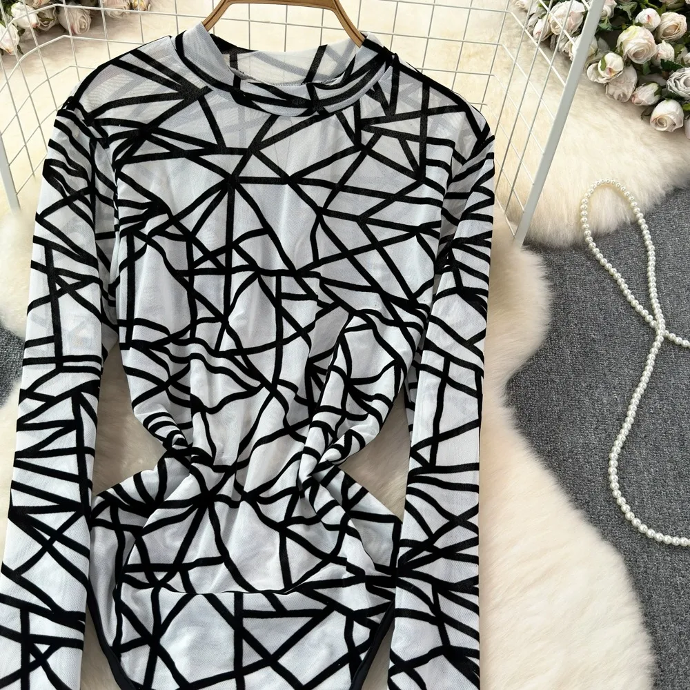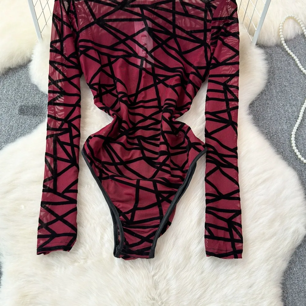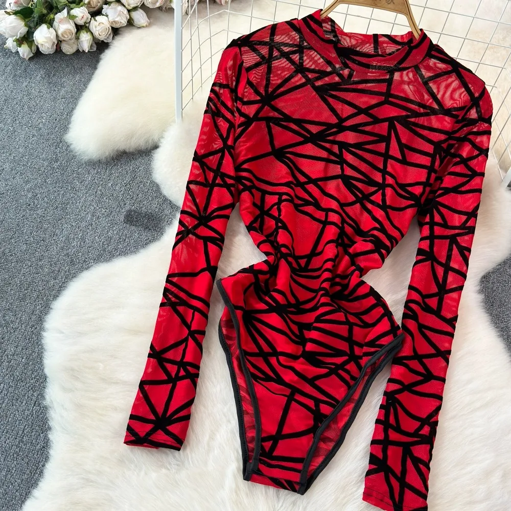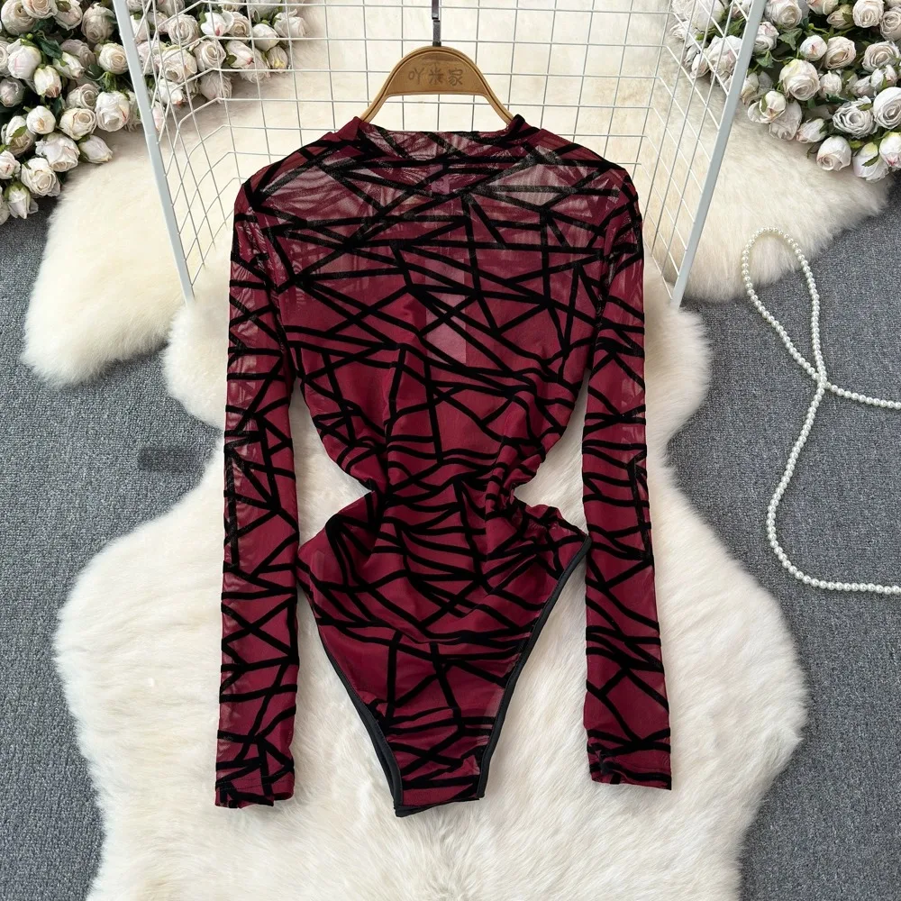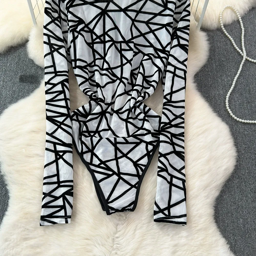 Foamlina Sexy Hollow Out Mesh Bodysuits for Women Fashion Striped Print Stand Collar Long Sleeve Slim Fit Club Party Jumpsuits