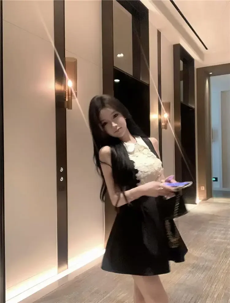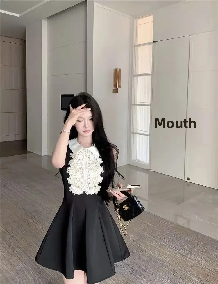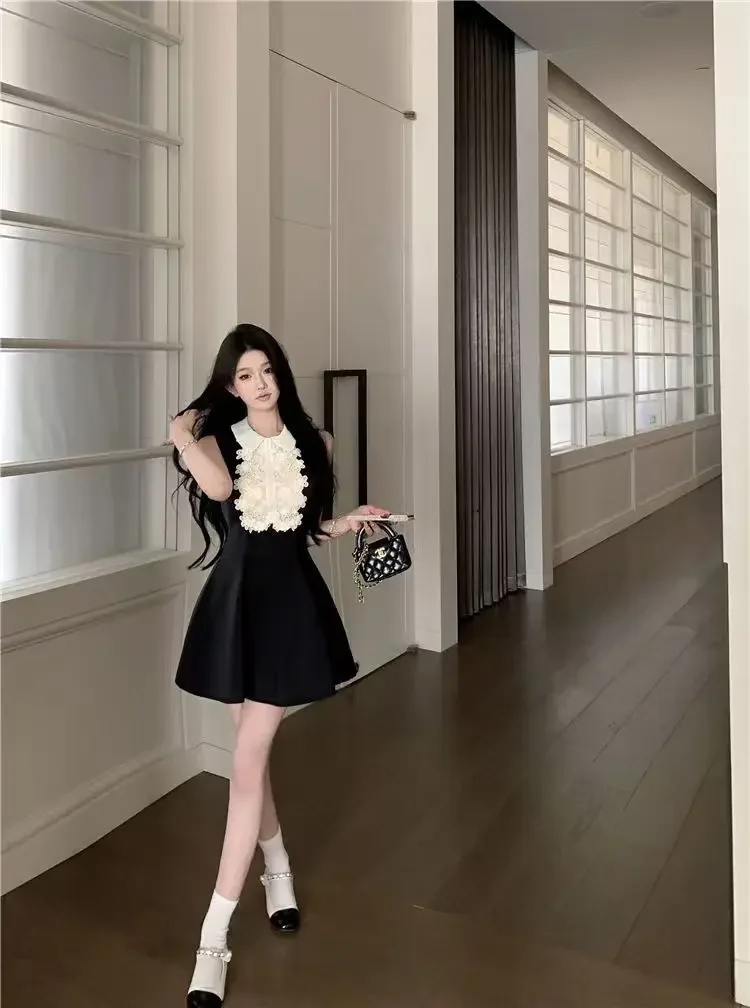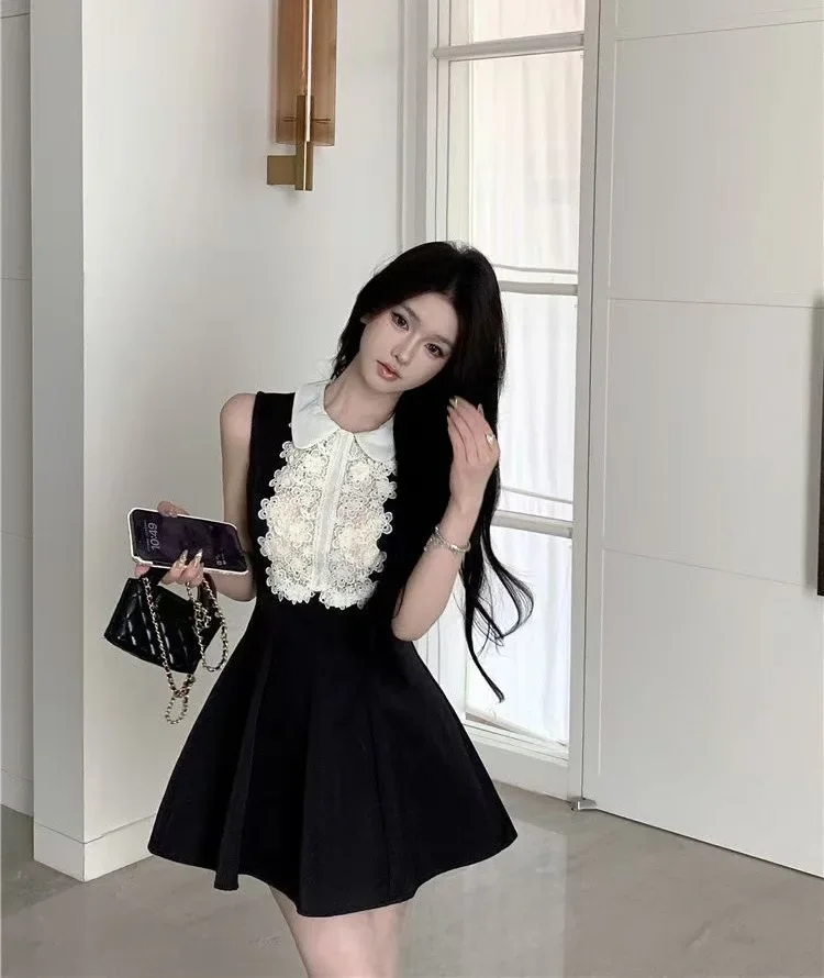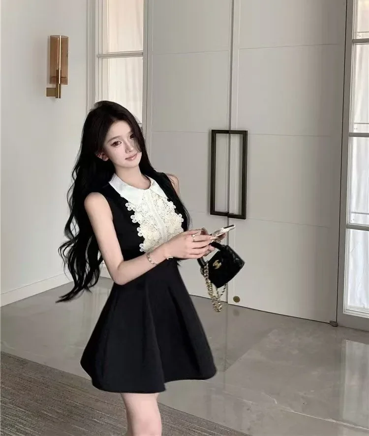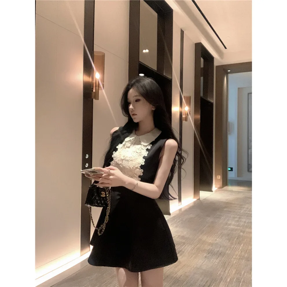 French Style Lace Doll Collar Vest Dress Women Summer Mini Skirt Waist Cinching Sleeveless Black Dress Polo Neckline Polyester F