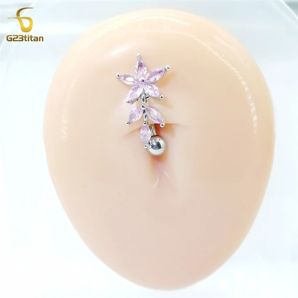 G23titan Pink Zircon Flower Belly Button Ring for Women 14G 6-16mm Titanium Curved Barbell Reverse Nave Bar Crystal Body Jewelry