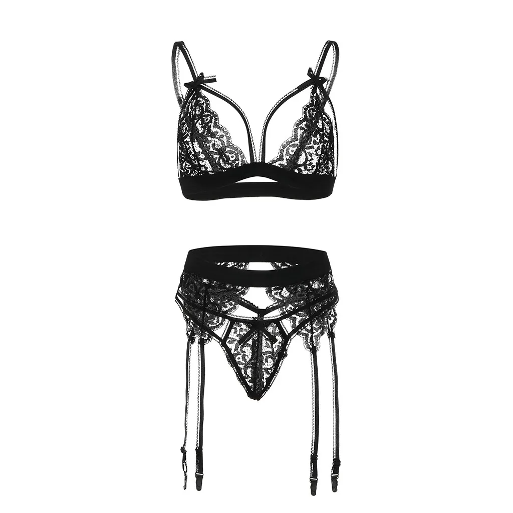 Leechee Sexy Women's Underwear Floral Lace Lingerie Set With Garter Black Wire Free Brassiere Transparent Underwear Bra Sets