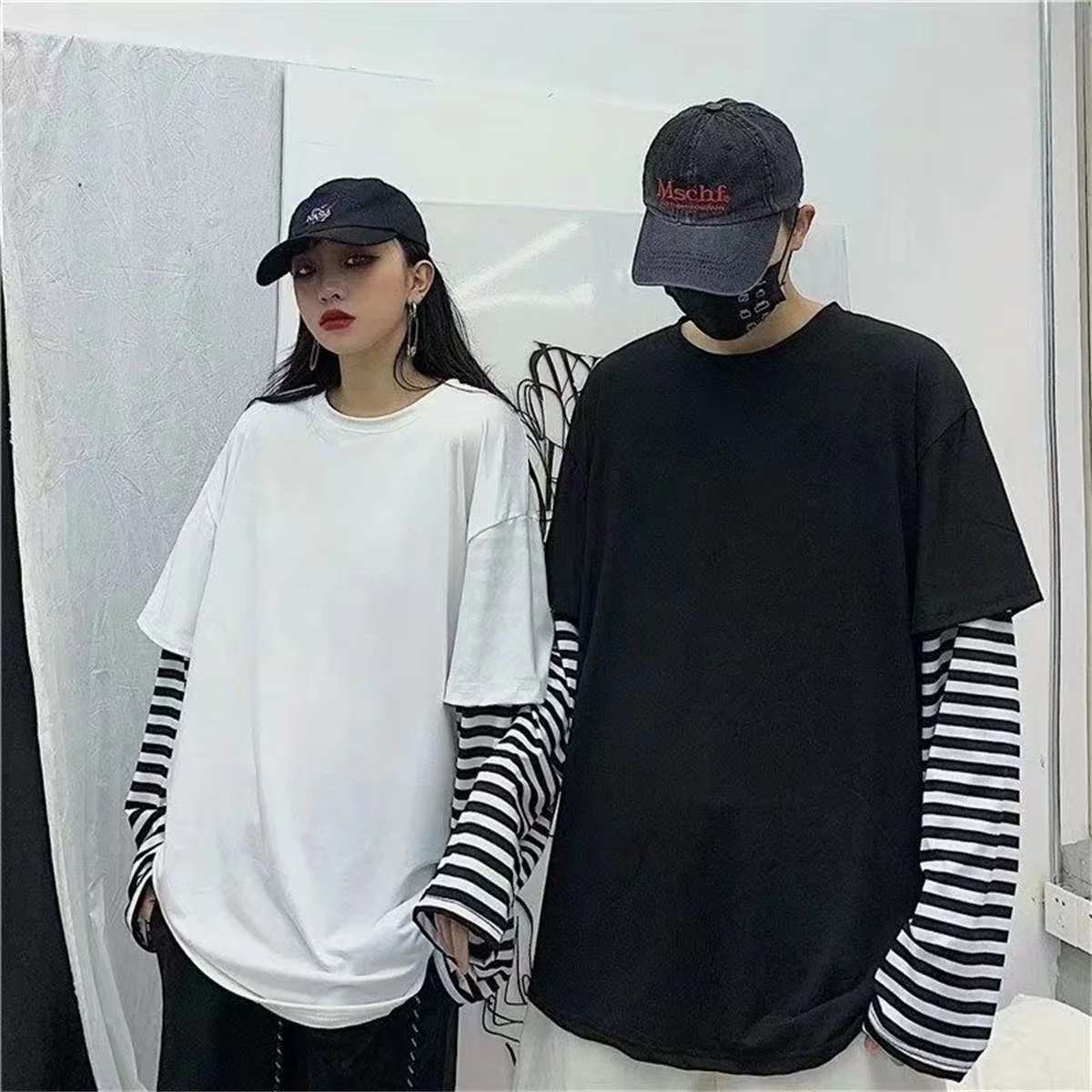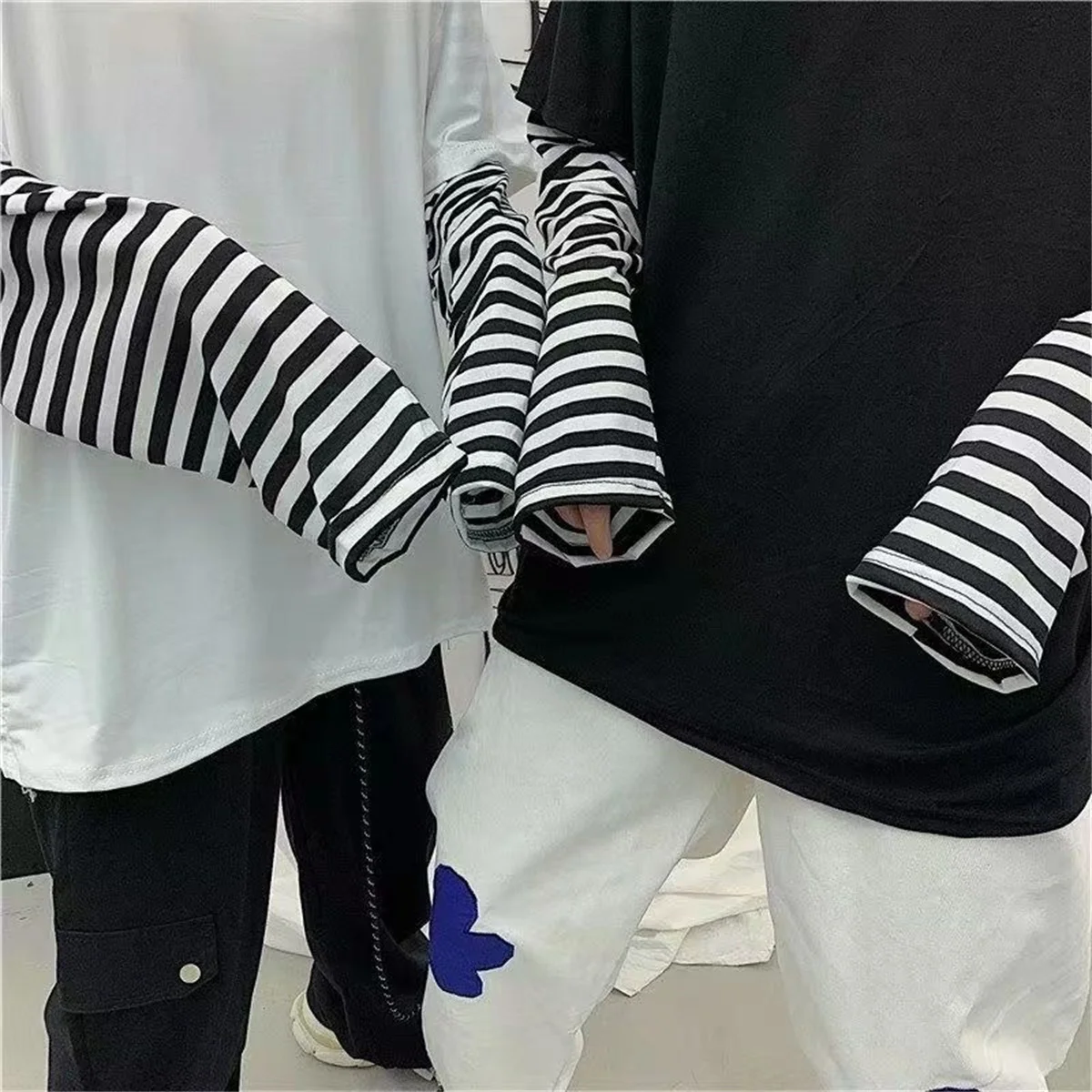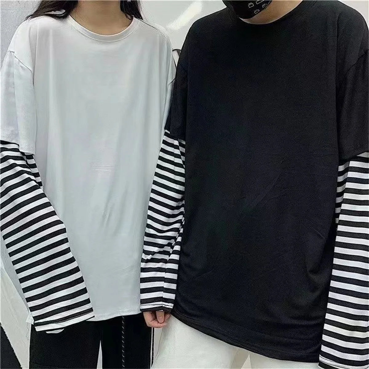 Long Sleeve Fake Two-piece T Shirt Striped Big Shirts Men Clothing Men Fashion Oversized Tees Clothes Tshirt Harajuku Tops Femme