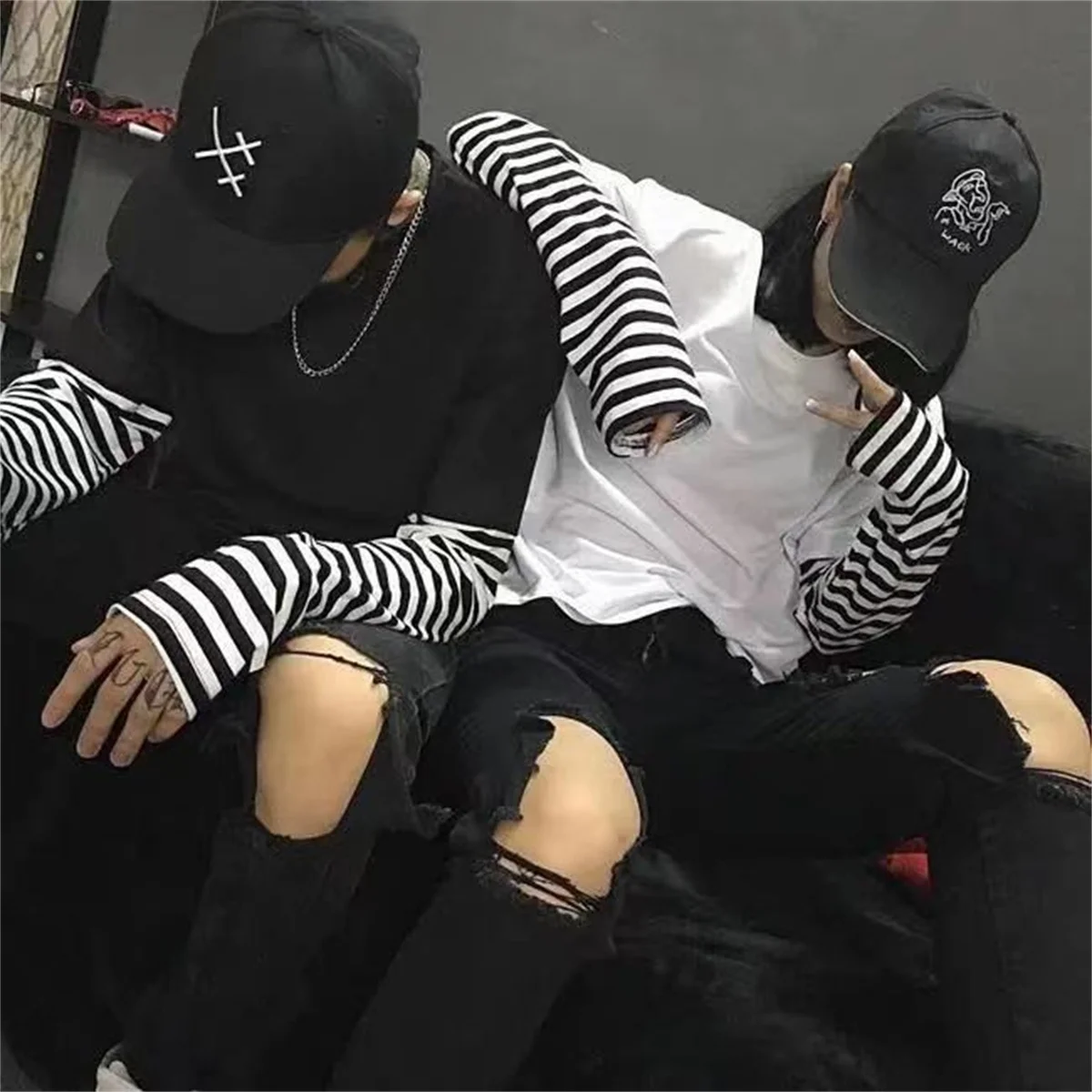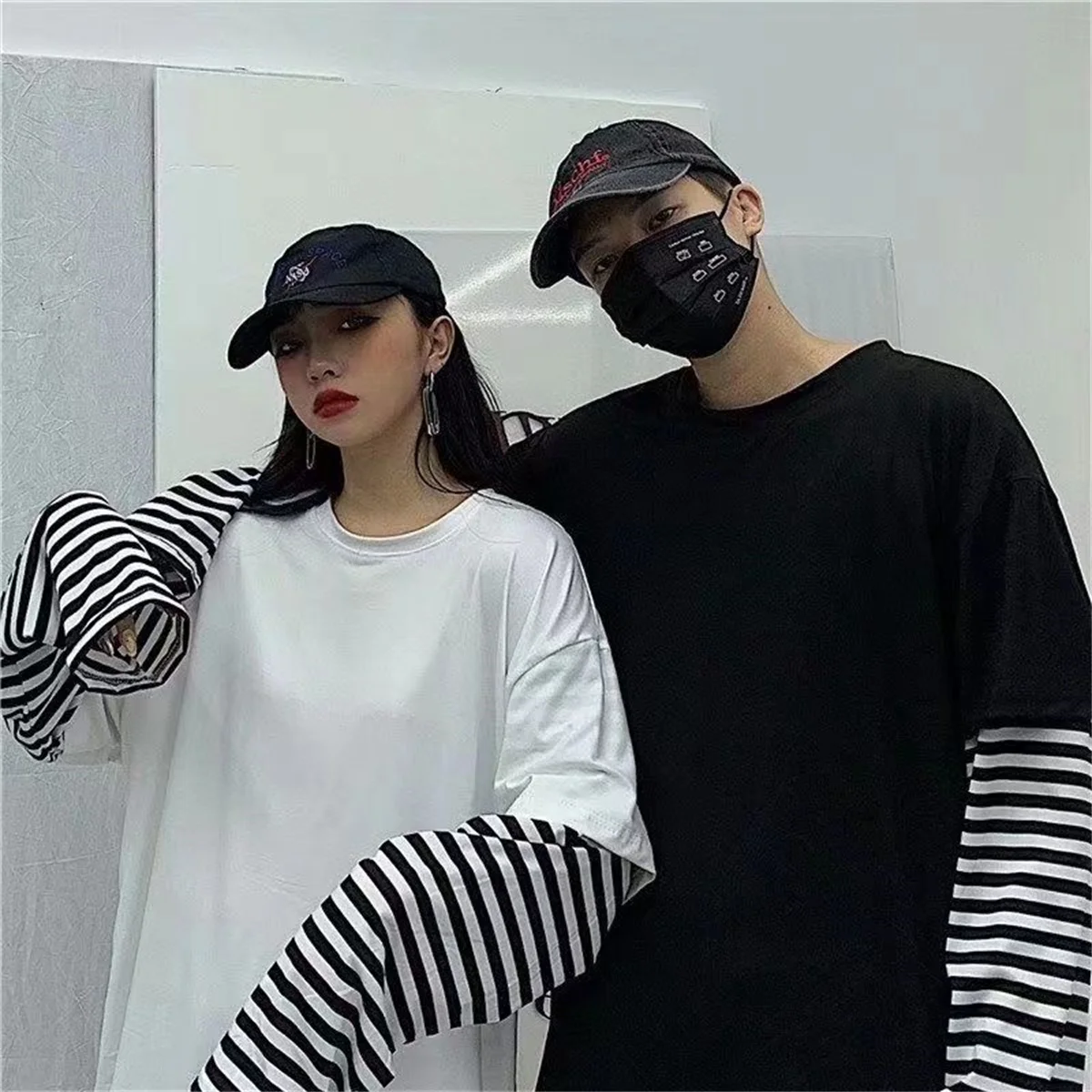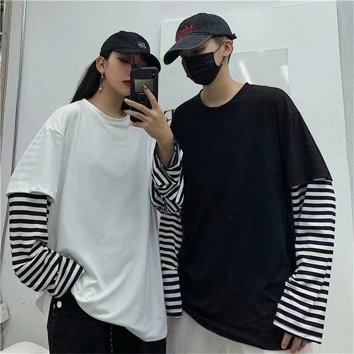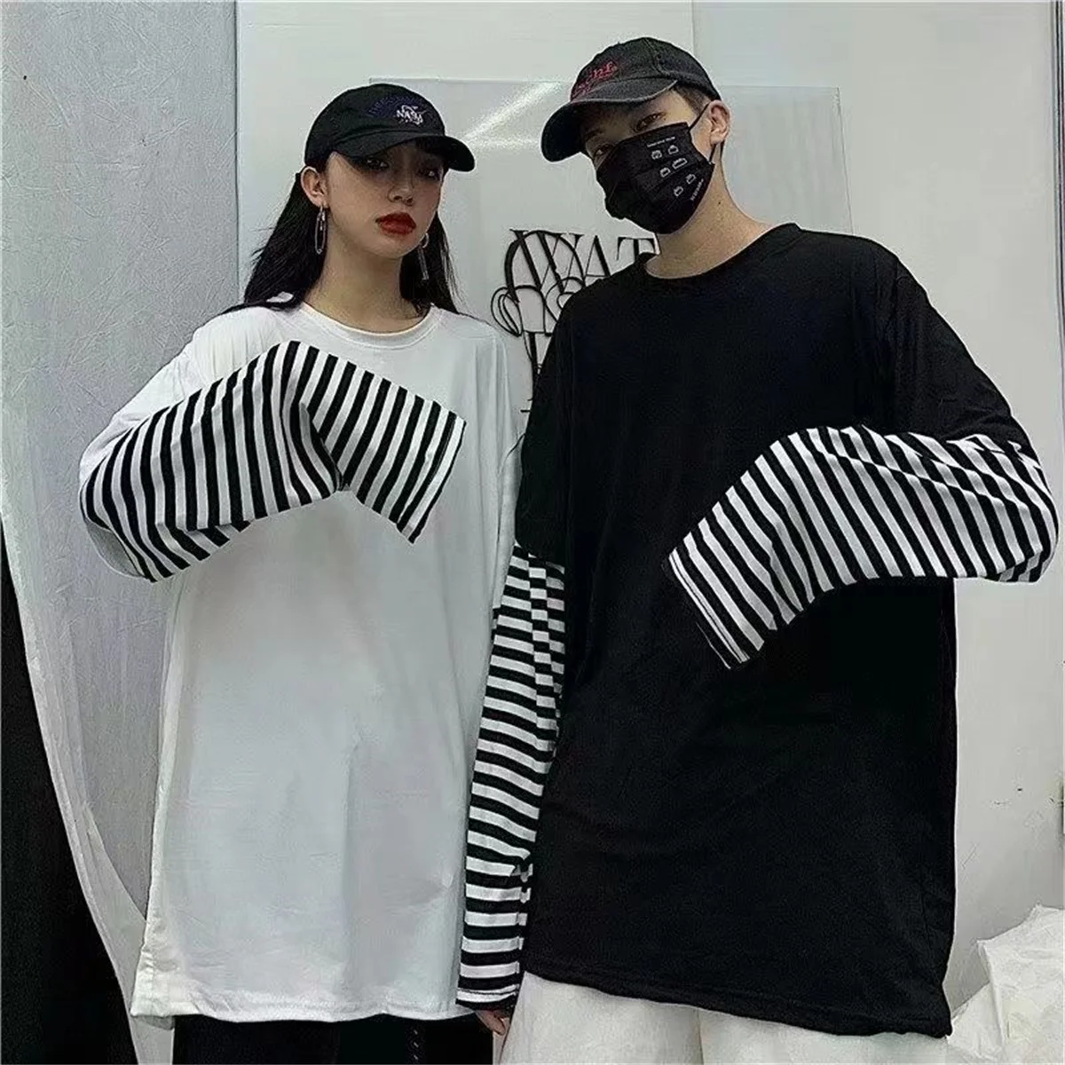 Long Sleeve Fake Two-piece T Shirt Striped Big Shirts Men Clothing Men Fashion Oversized Tees Clothes Tshirt Harajuku Tops Femme