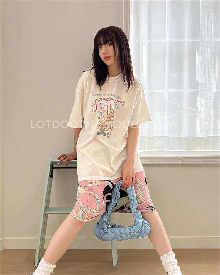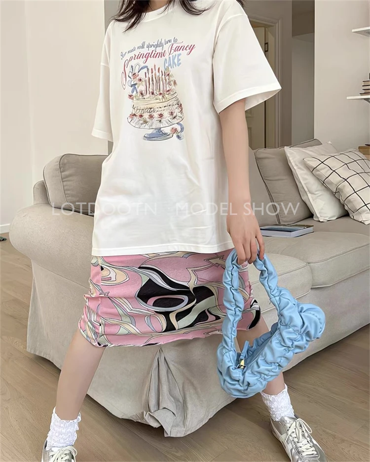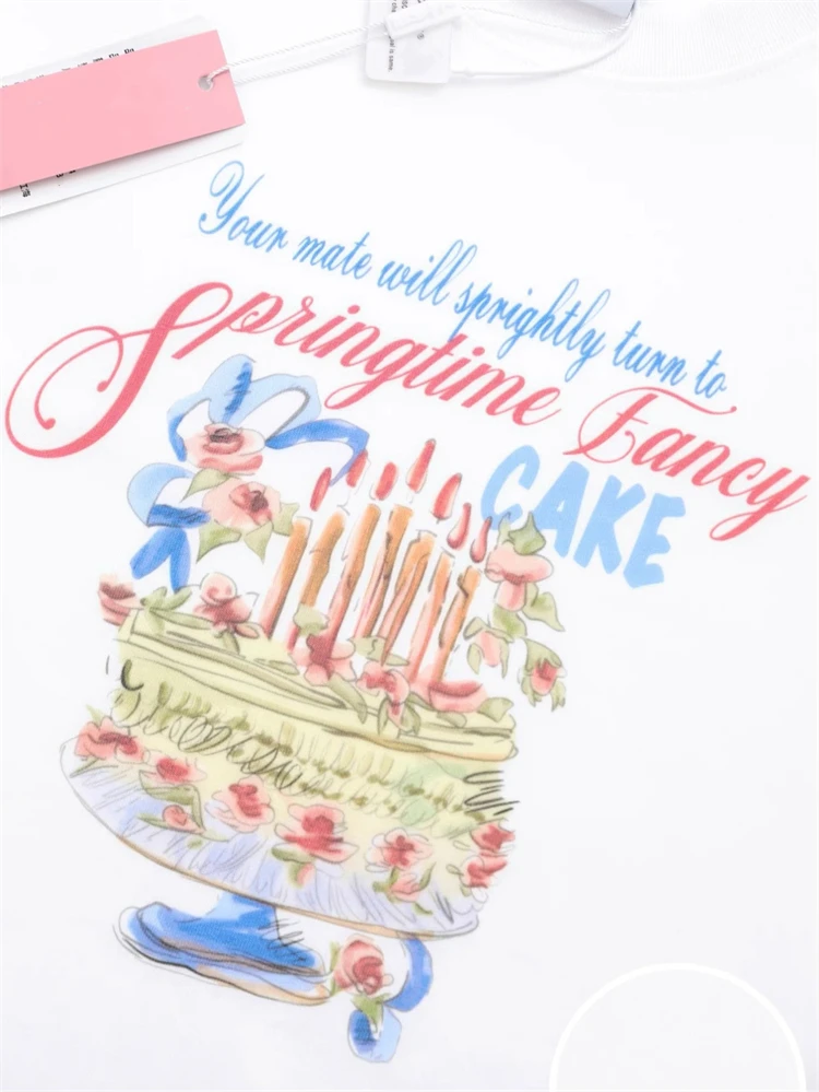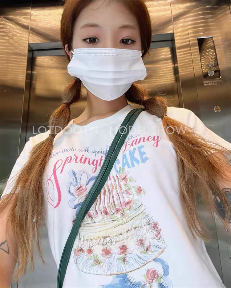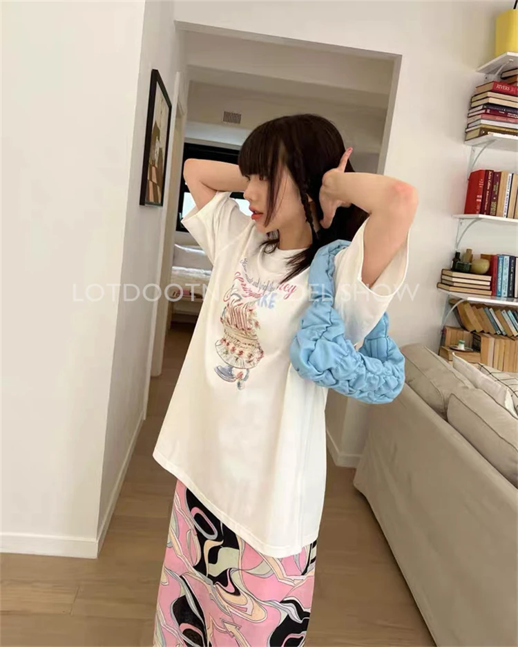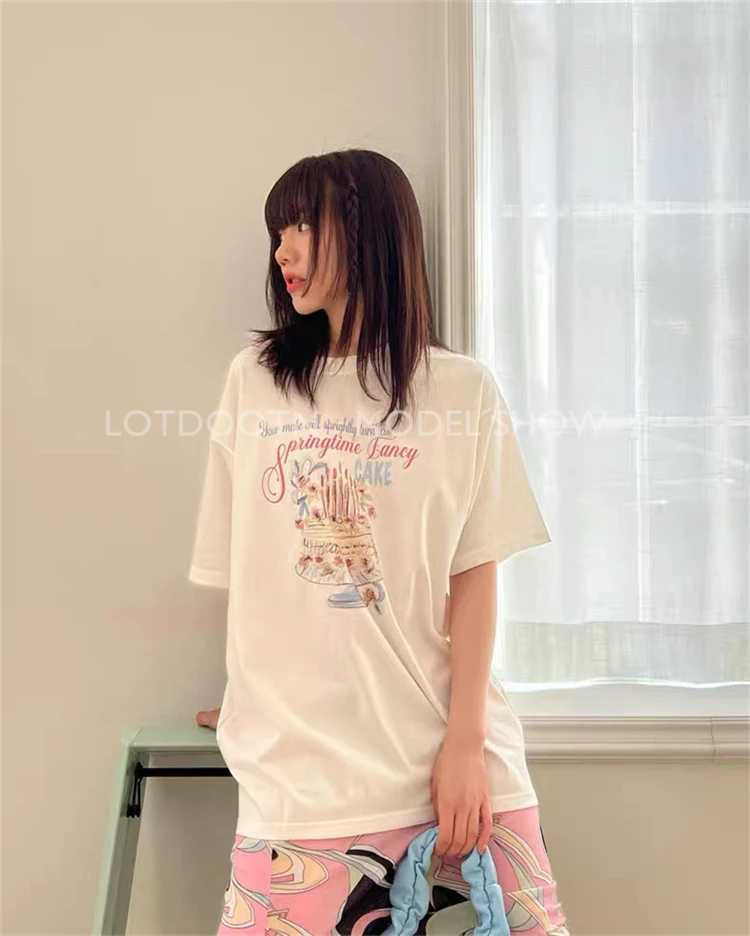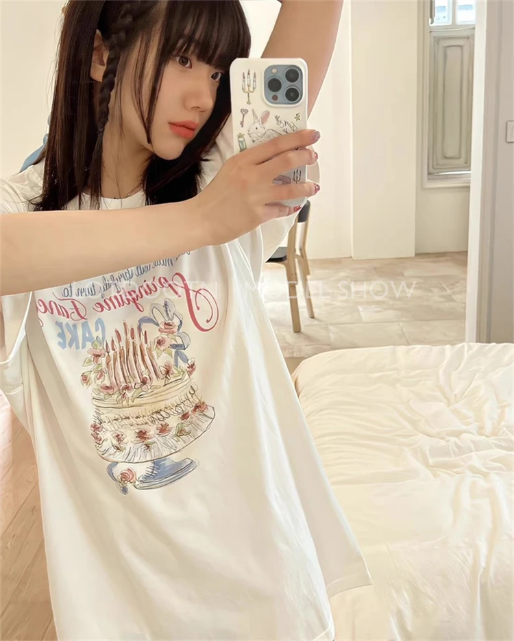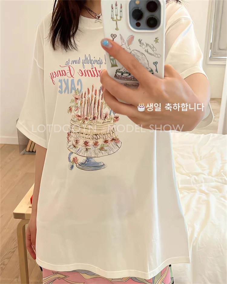 LOTDOOTN Loose Short Sleeve T-Shirt Cake Print Sweet Design Korean Casual Cotton Crew Neck Tops Female Summer Fashion Tee Shirts
