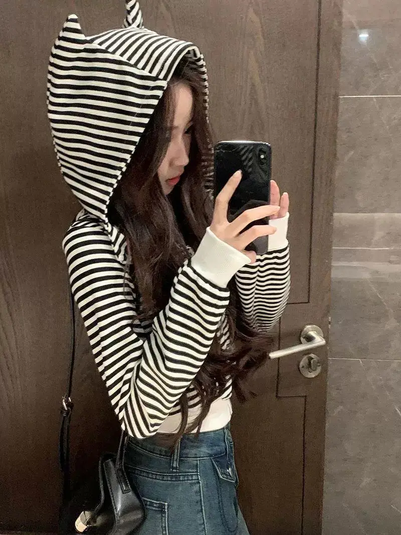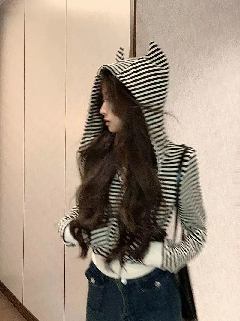 「MD」Demon Stripes Loose Short Coat for Women Spring Autumn Korean Sle Zipper Hoodie Cardigan Design Sense Top