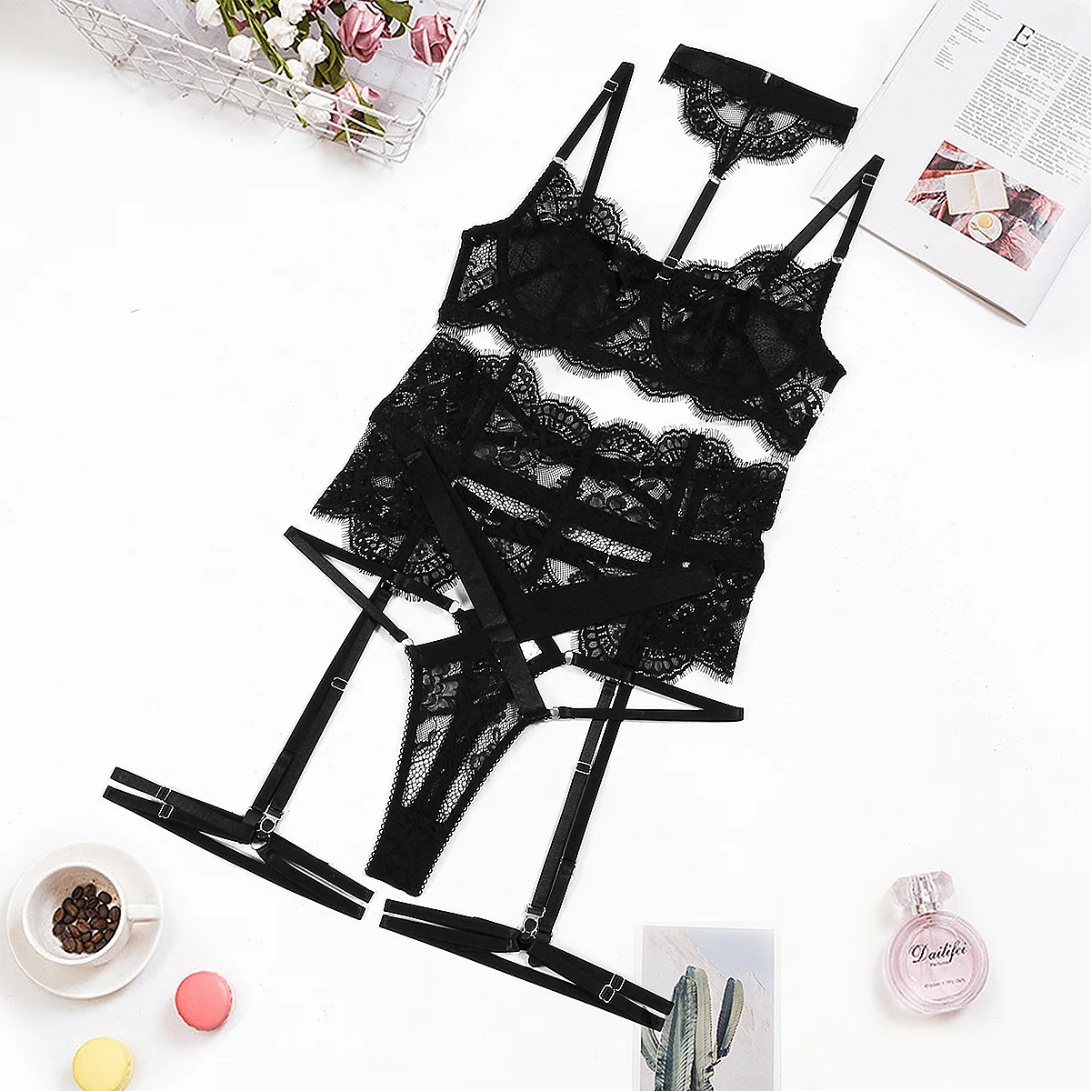 New lace pick-up body sculpting sex set perspective neck sexy underwear four-piece set lace bodysuit body suit sexy lingerie