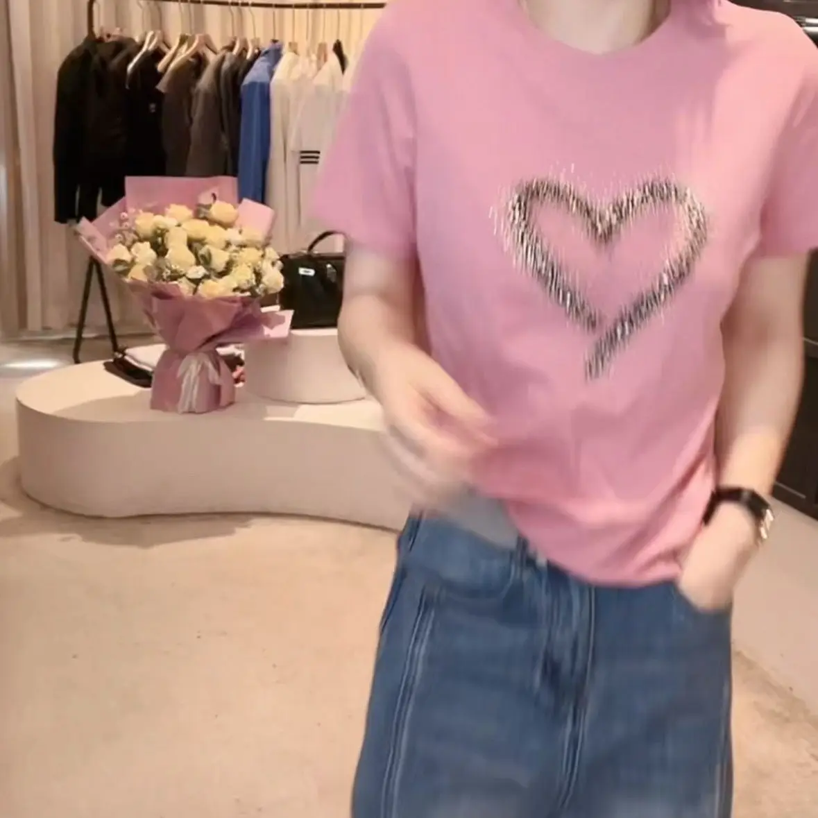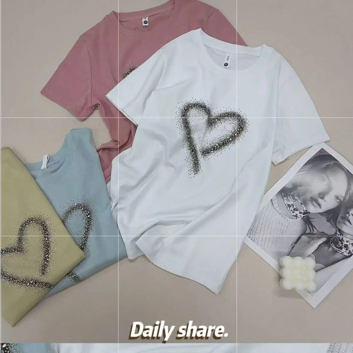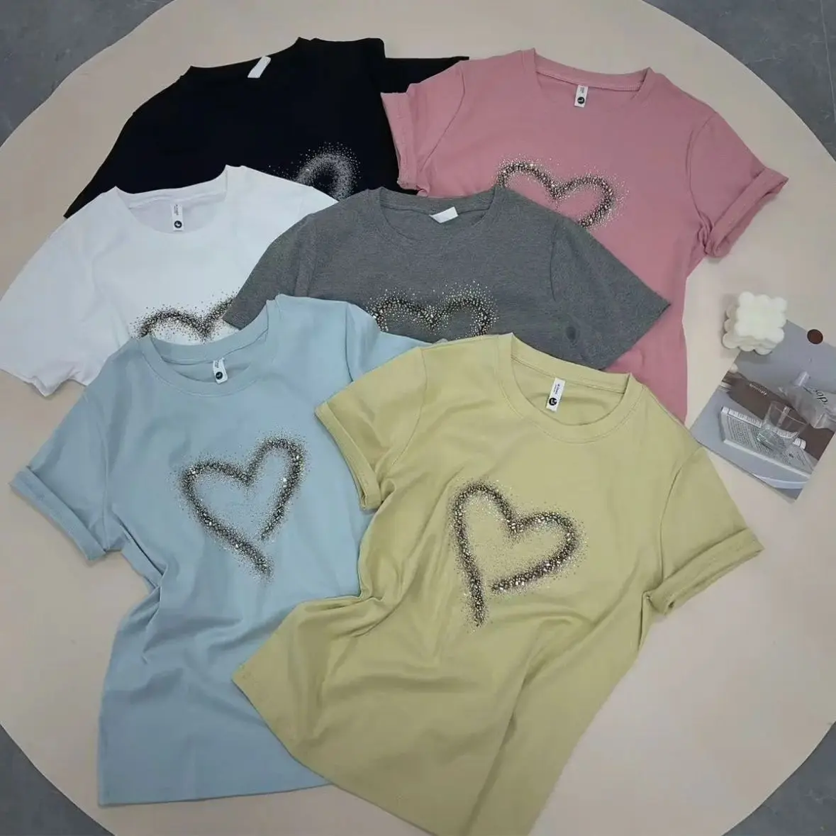 Pure Cotton Round Neck Short Sleeve Diamond Heart Print Tshirt Women Loose Casual Elegant Top