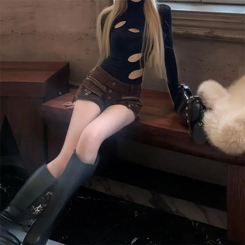 Sexy Dot Hollow Out Bodysuit Y2K Gothic Punk Long Sleeves Skinny High Collar T-shirt Women Autumn Streetwear Slim Bodysuits