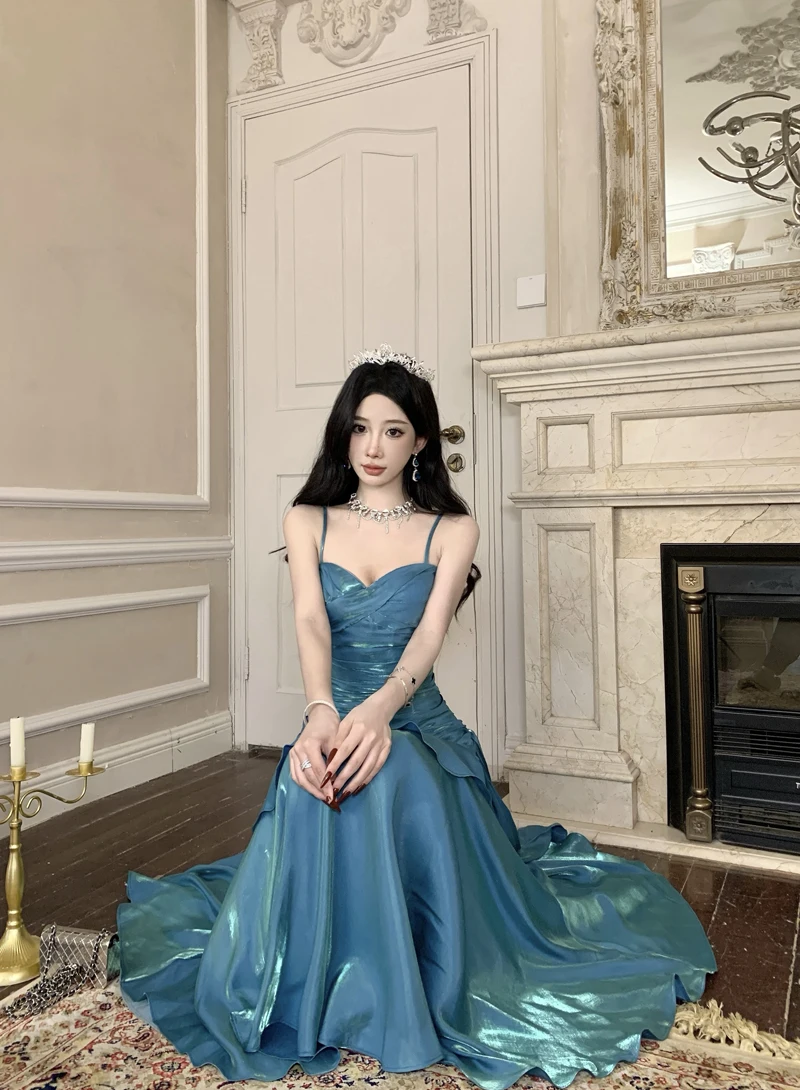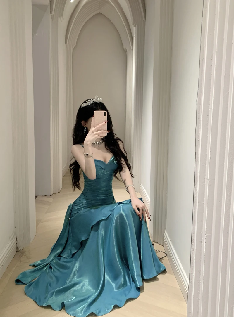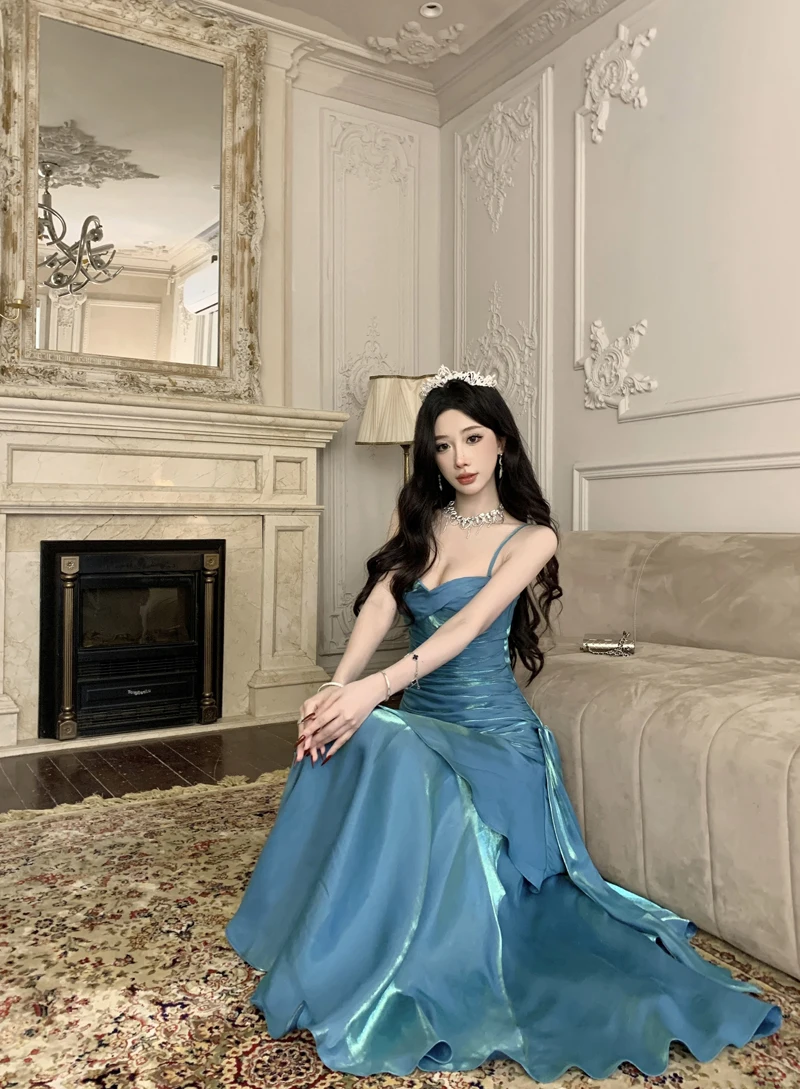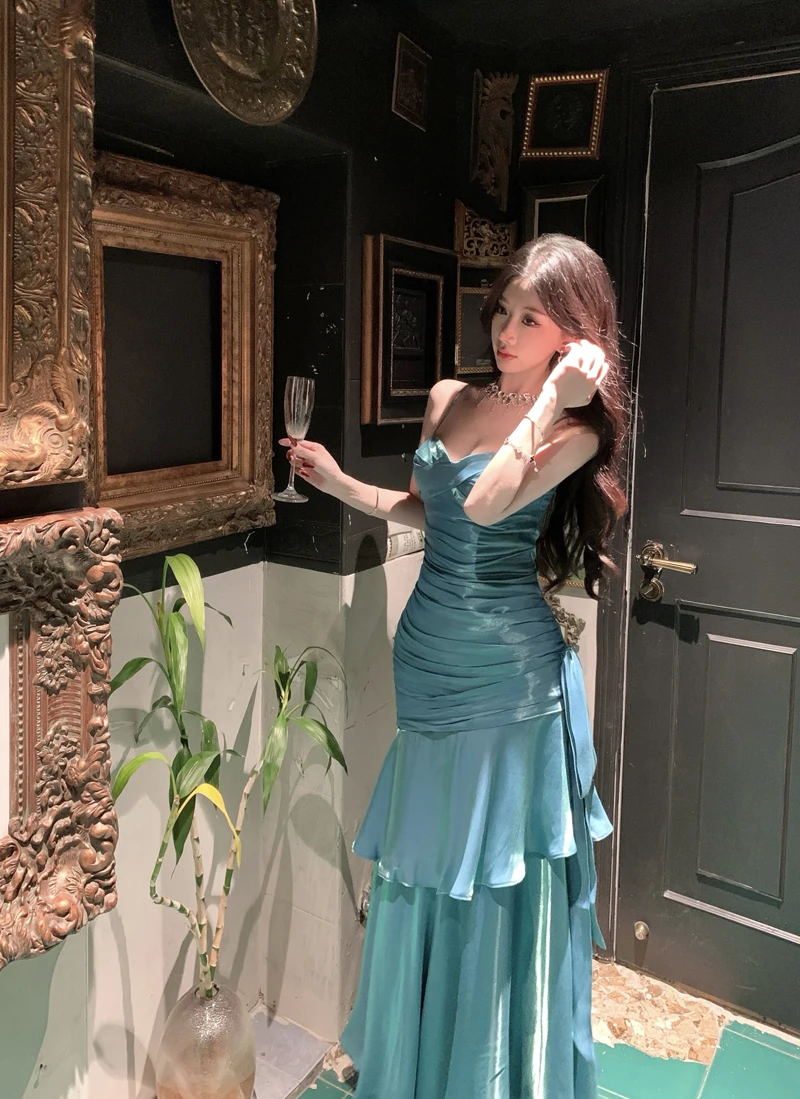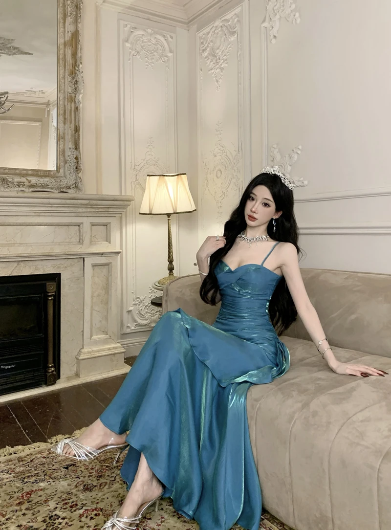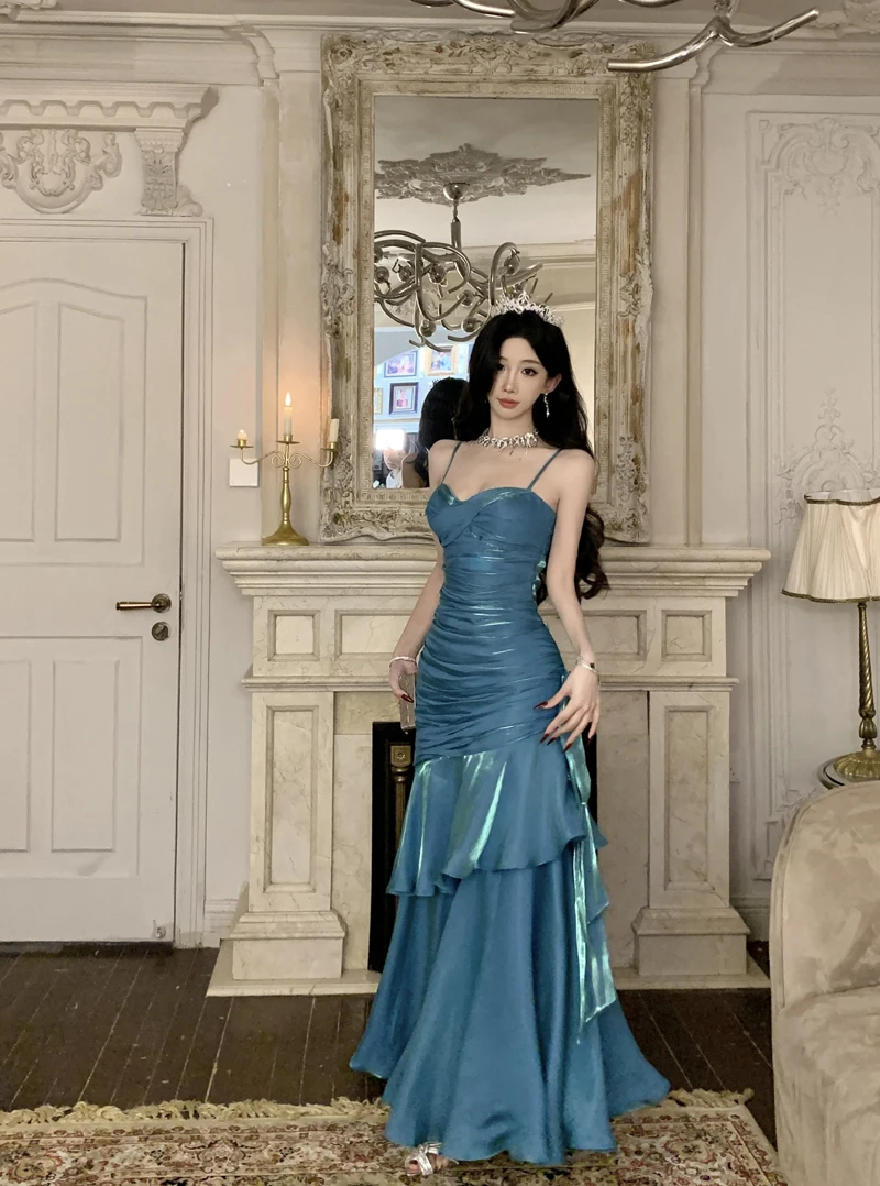 Sexy Shiny Glitter Mermaid Evening Party Prom Gowns Spring Summer Spaghetti Strap Ruffled Dresses Sleeveless Slim Waist Robe