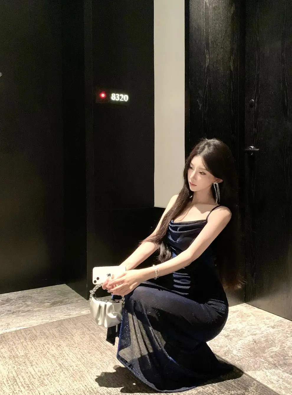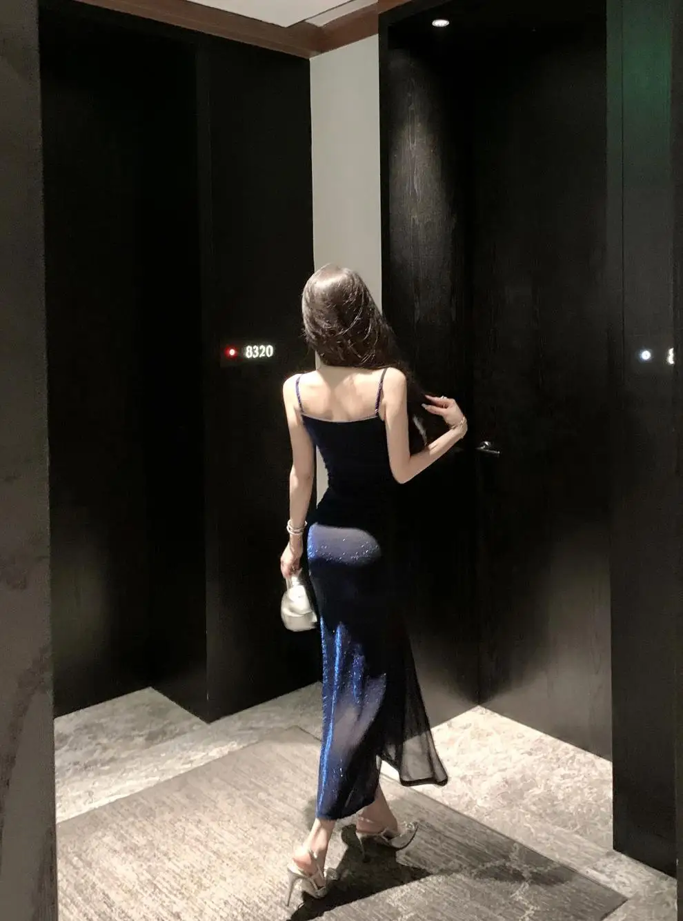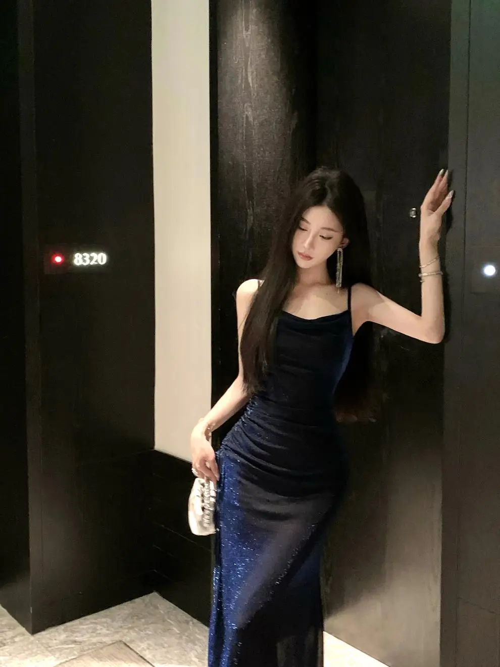 Starlight Sexy Swinging Collar Strap Dress, Mid to Long, Waist Tight, Slim and High End Beach Dress