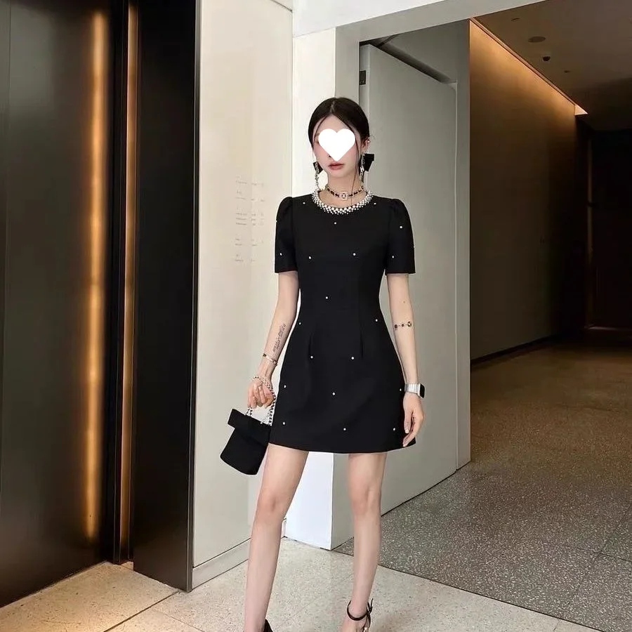 Sweet Elegant round Neck Waist-Cinched Mini Skirt Dress Hepburn Style Beaded New Summer Collection Fashionable Chinese Brand