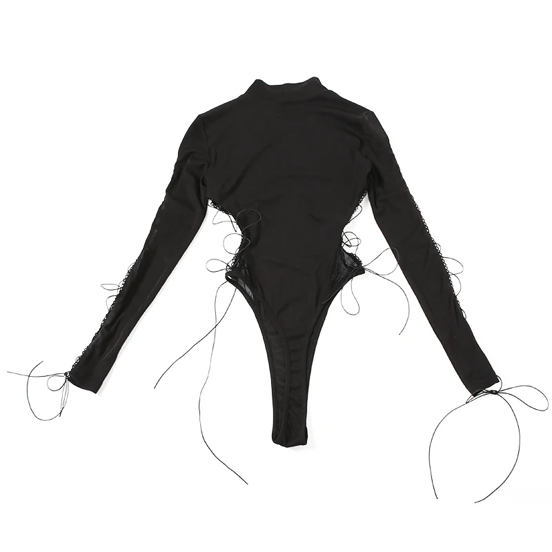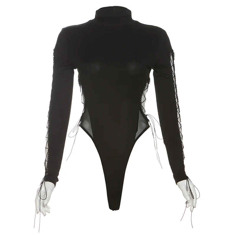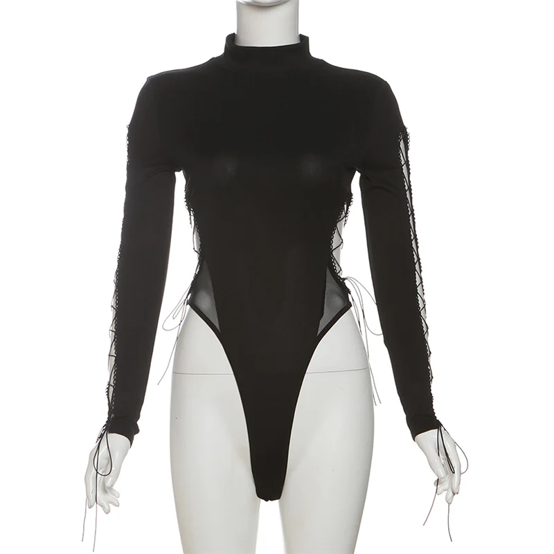SylCue Irregular Hollow Solid Skinny Bodysuit Women Turtleneck Shirring Full Sleeve Spicy Girl Fashion Trend Classic Streetwear
