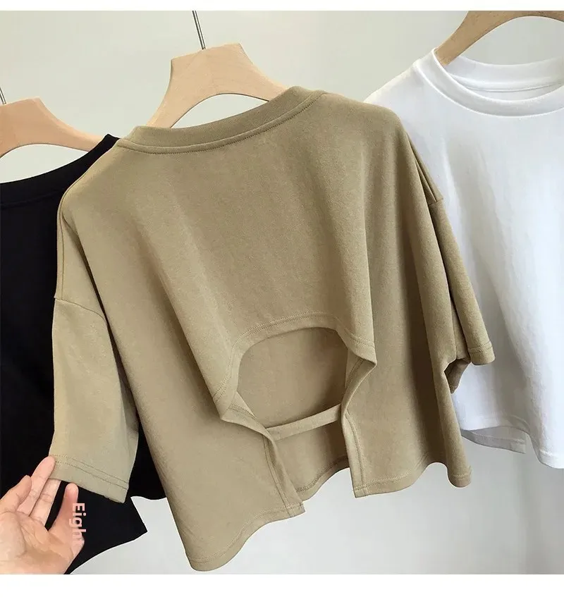 Trendy Women's Open-Back Cropped T-Shirt Sweet Spicy Style Korean Version 2023 Summer New Round Neck Loose Fit Short Sleeves Top