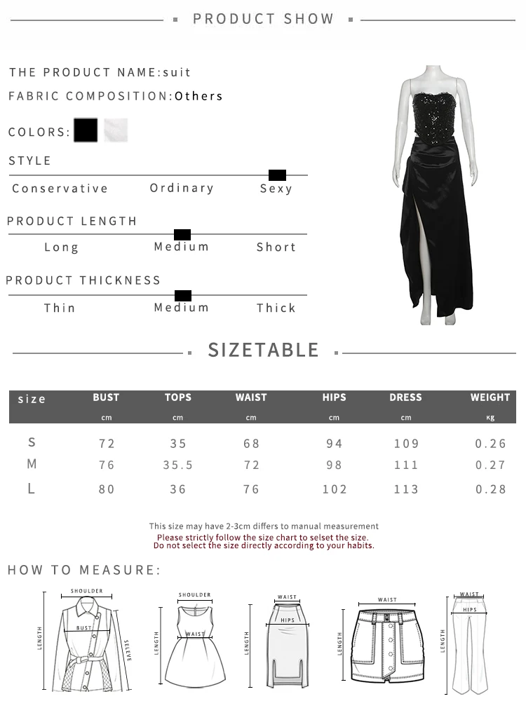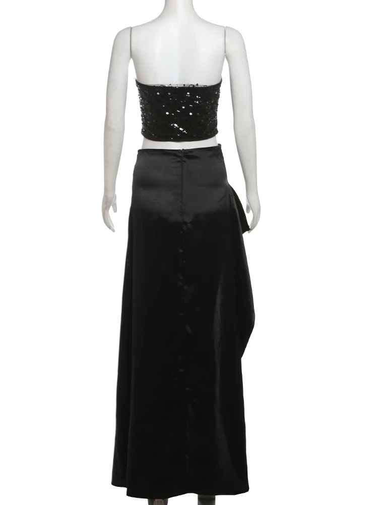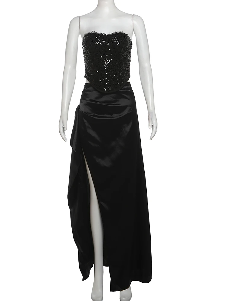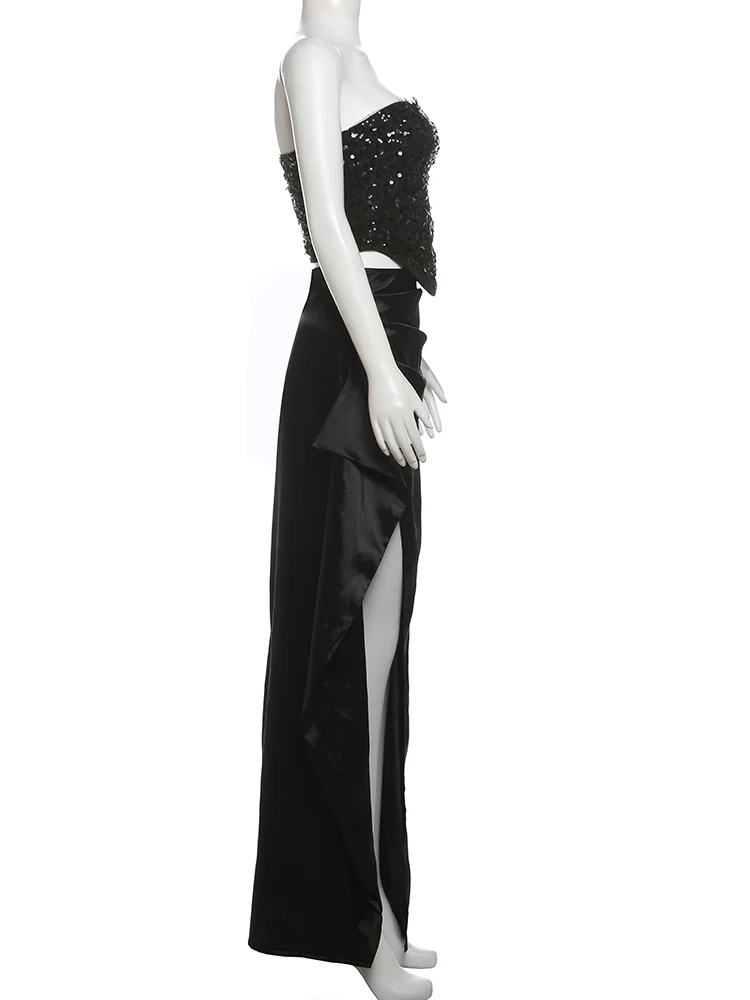 Weird Puss Prom Elegant 2 Piece Set Women Sequins Patchwork Backless Tube Tops+Ruched Slits Long Skirts Matching Sexy Trend Suit