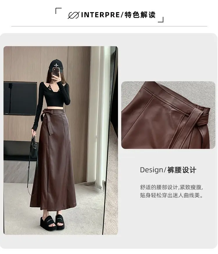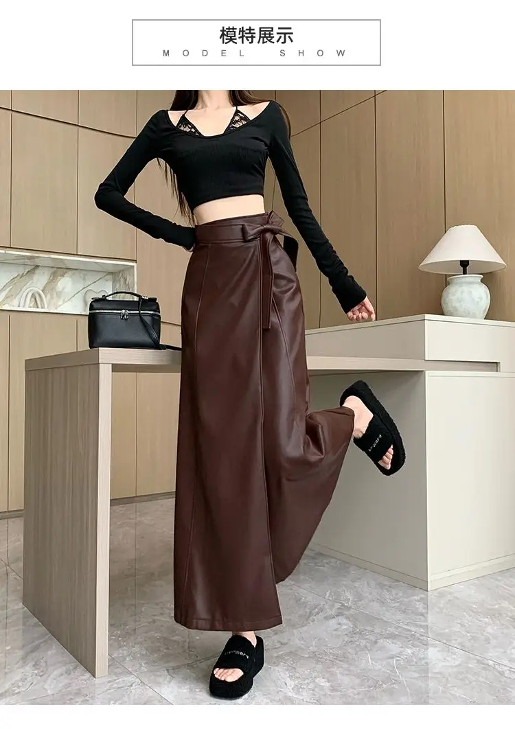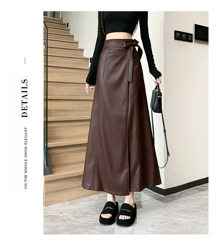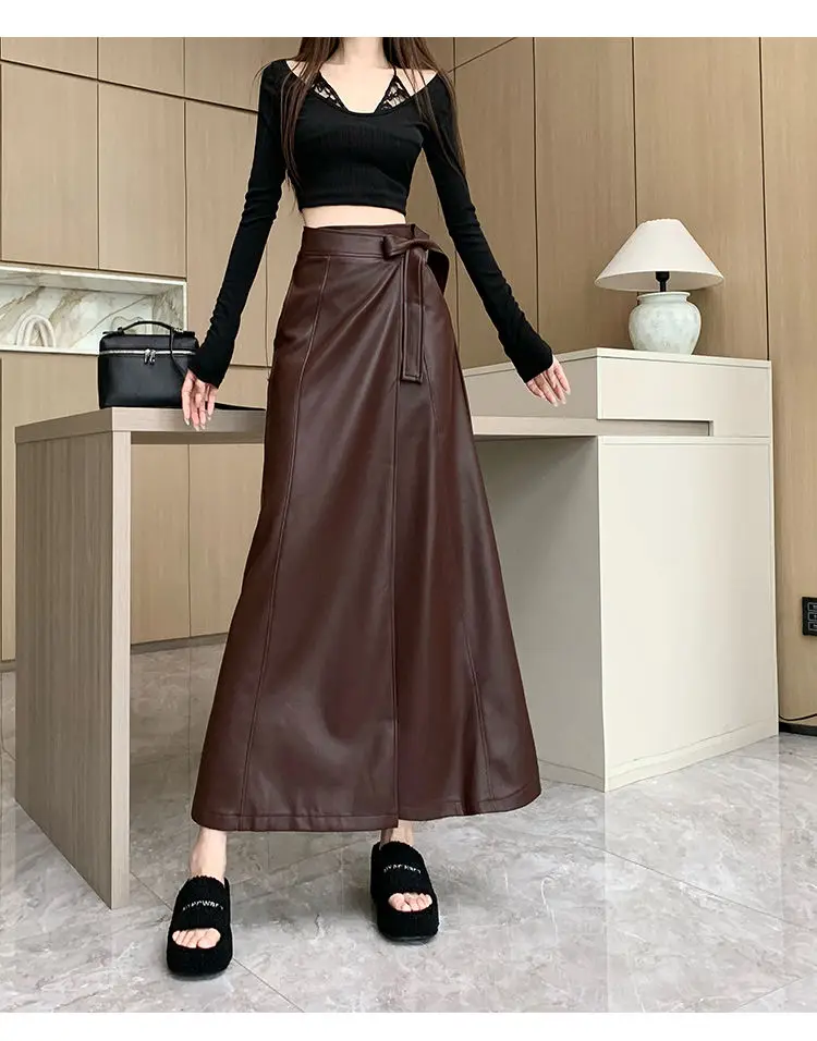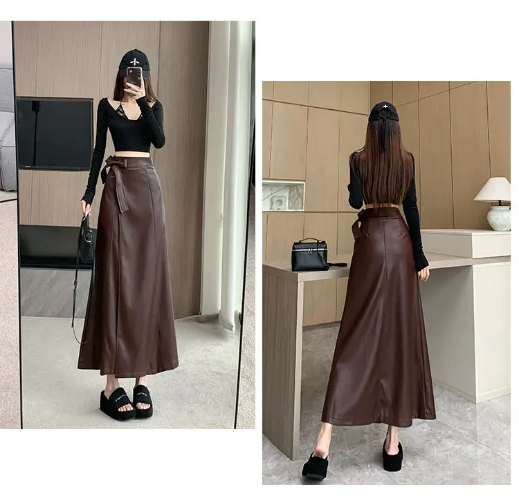 Women Clothing Autumn Winter Vintage Elegant Lace-up PU Leather Long Skirts Female Red High Waist Slim A-line Maxi Skirt Faldas