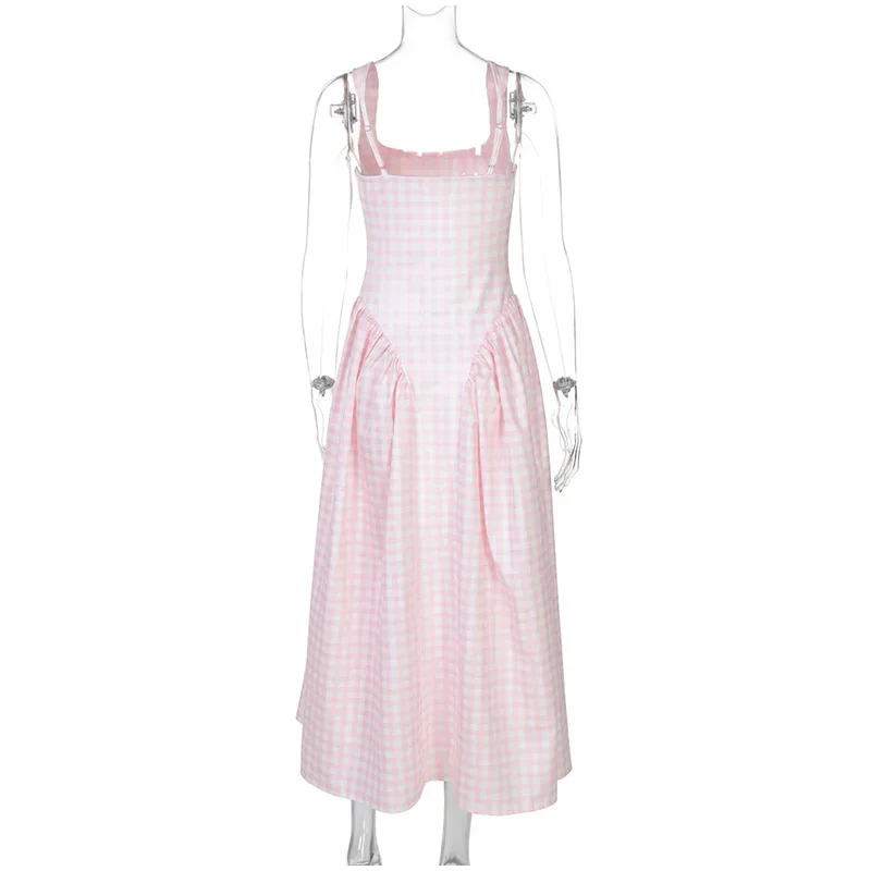 Women Fashion Plaids Pleated High Waist A-line Dress Elegant Sleeveless Backless Slim Long Dresses Summer New Party Streetwear