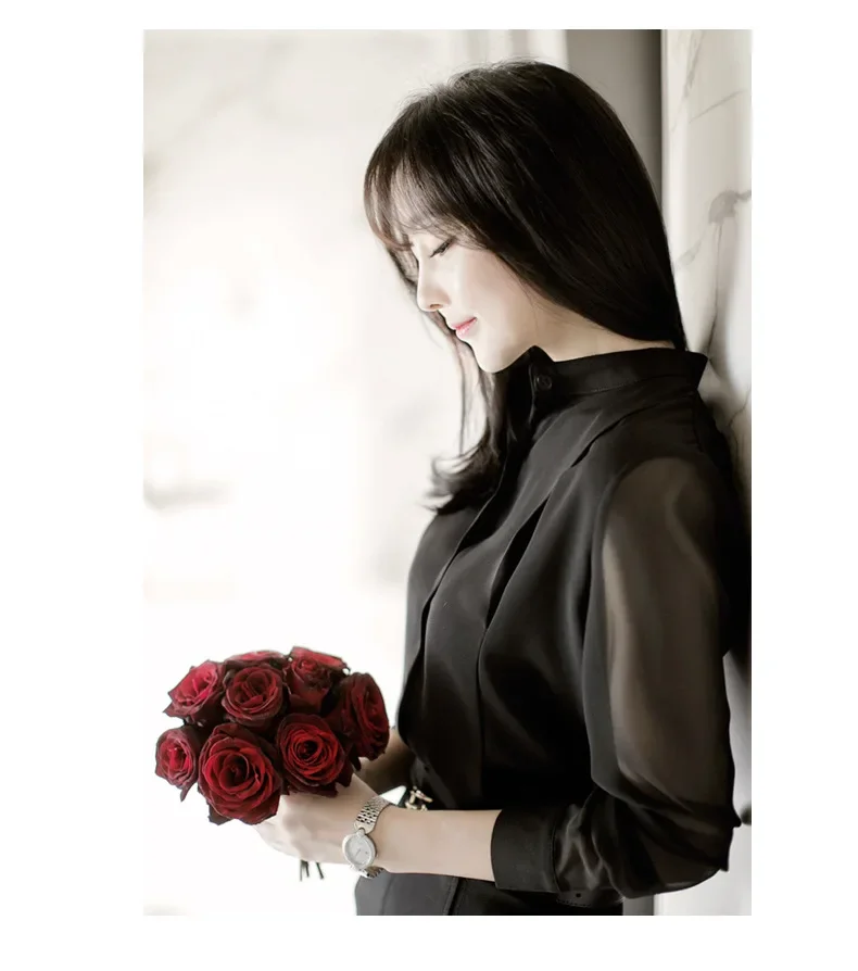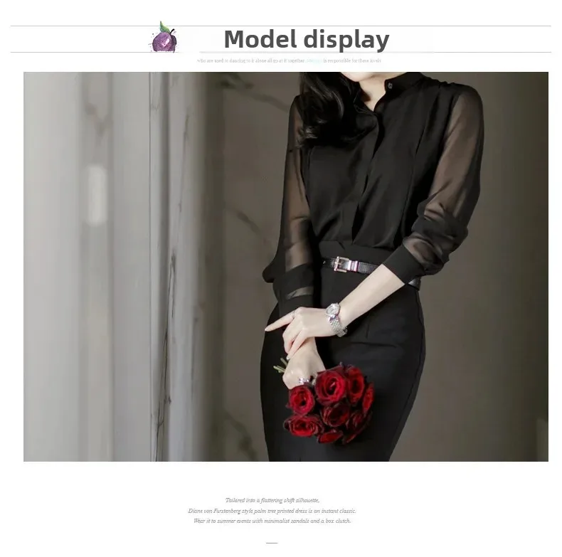 Women's Long Sleeve Sexy Chiffon Blouse 2024 Spring Summer New Korean Style Slimming Black Stand Collar Shirt