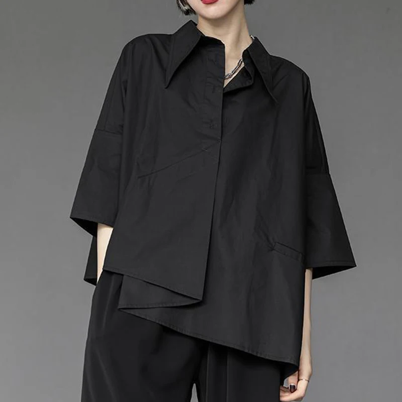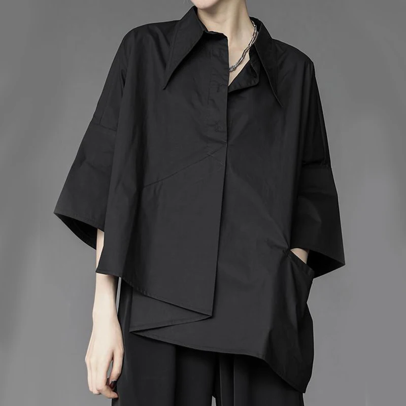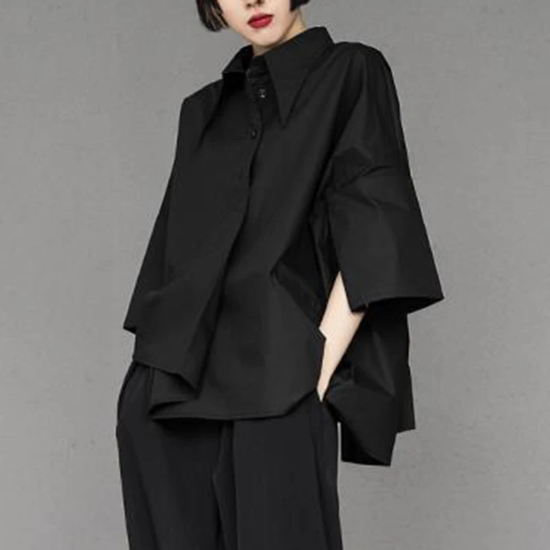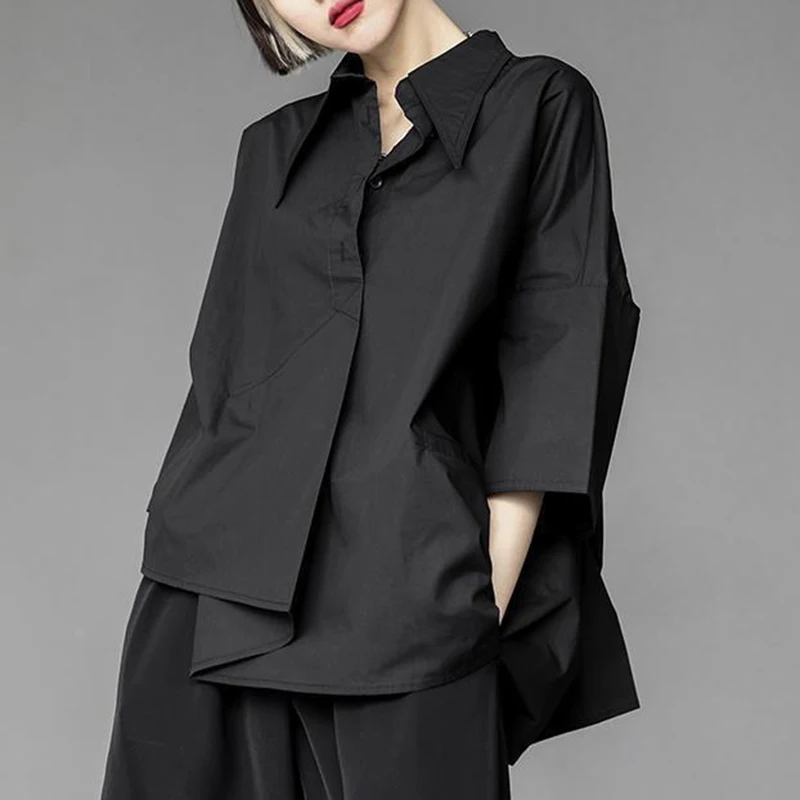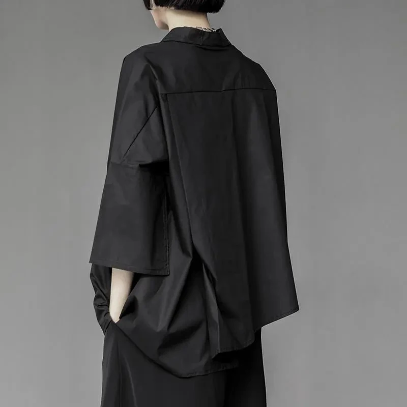 Y2K Women Chiffon Black Shirt Gothic Fashion Streetwear Loose Tops Dark Academic Irregular Casual Three Quarter Female Blouse